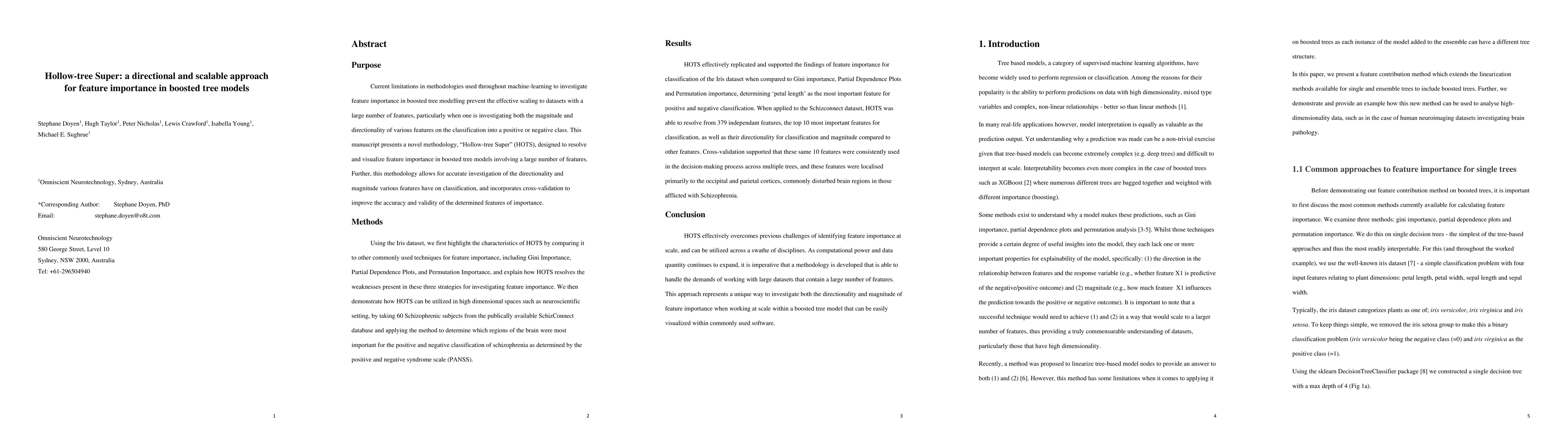 Current limitations in boosted tree modelling prevent the effective scaling to datasets with a large feature number, particularly when investigating the magnitude and directionality of various features on classification. We present a novel methodology, Hollow-tree Super (HOTS), to resolve and visualize feature importance in boosted tree models involving a large number of features. Further, HOTS allows for investigation of the directionality and magnitude various features have on classification. Using the Iris dataset, we first compare HOTS to Gini Importance, Partial Dependence Plots, and Permutation Importance, and demonstrate how HOTS resolves the weaknesses present in these methods. We then show how HOTS can be utilized in high dimensional neuroscientific data, by taking 60 Schizophrenic subjects and applying the method to determine which brain regions were most important for classification of schizophrenia as determined by the PANSS. HOTS effectively replicated and supported the findings of Gini importance, Partial Dependence Plots and Permutation importance within the Iris dataset. When applied to the schizophrenic brain dataset, HOTS was able to resolve the top 10 most important features for classification, as well as their directionality for classification and magnitude compared to other features. Cross-validation supported that these same 10 features were consistently used in the decision-making process across multiple trees, and these features were localised primarily to the occipital and parietal cortices, commonly disturbed brain regions in those with Schizophrenia. It is imperative that a methodology is developed that is able to handle the demands of working with large datasets that contain a large number of features. HOTS represents a unique way to investigate both the directionality and magnitude of feature importance when working at scale with boosted-tree modelling.