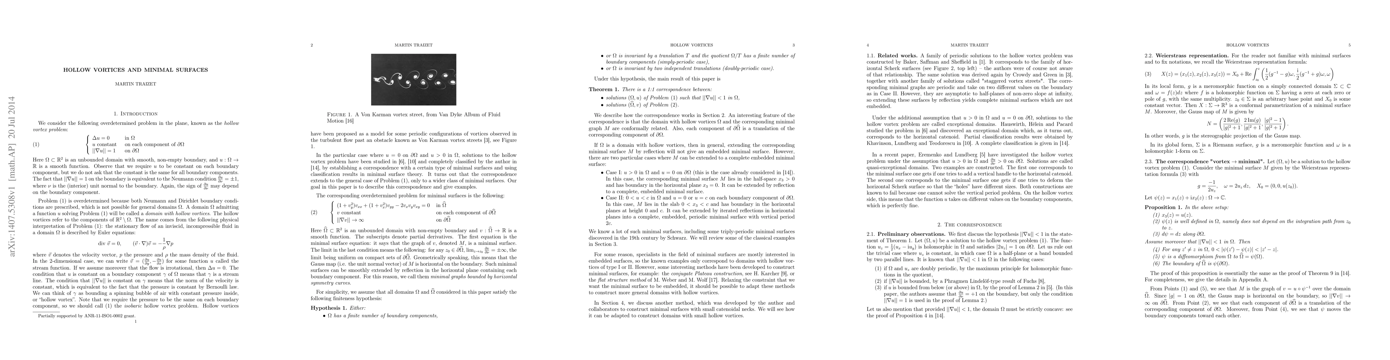 This paper establishes a one-to-one correspondence between solutions to the hollow vortex problem and minimal surfaces bounded by horizontal symmetry lines, providing examples of domains featuring such minimal surfaces.