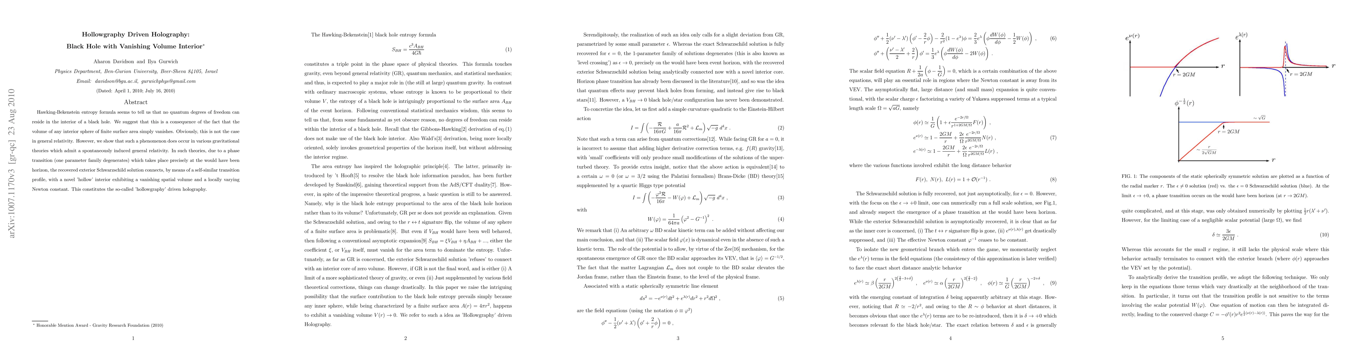 Hawking-Bekenstein entropy formula seems to tell us that no quantum degrees of freedom can reside in the interior of a black hole. We suggest that this is a consequence of the fact that the volume of any interior sphere of finite surface area simply vanishes. Obviously, this is not the case in general relativity. However, we show that such a phenomenon does occur in various gravitational theories which admit a spontaneously induced general relativity. In such theories, due to a phase transition (one parameter family degenerates) which takes place precisely at the would have been horizon, the recovered exterior Schwarzschild solution connects, by means of a self-similar transition profile, with a novel 'hollow' interior exhibiting a vanishing spatial volume and a locally varying Newton constant. This constitutes the so-called 'hollowgraphy' driven holography.