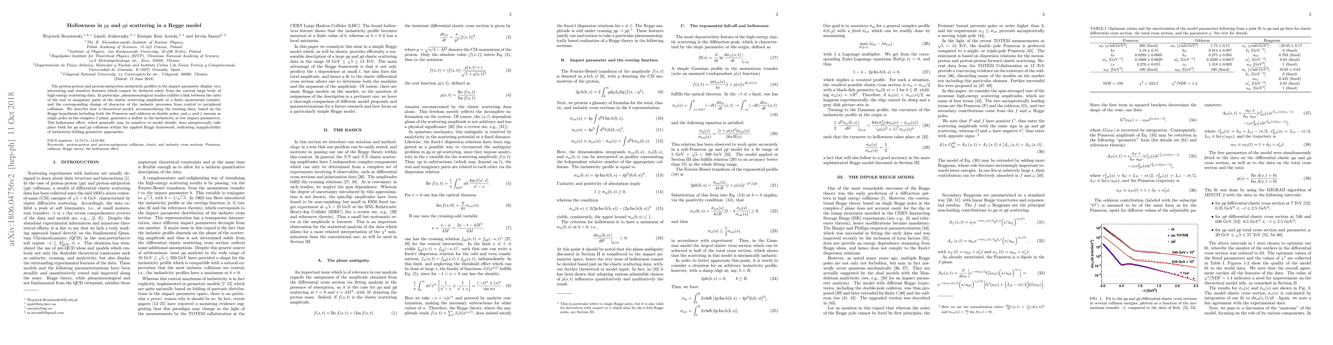 The Regge model with double-pole Pomeron and odderon components, along with ω and f mesons, provides a comprehensive description of elastic and inelastic pp and p¯p scattering data, capturing the hollowness effect at LHC energies.