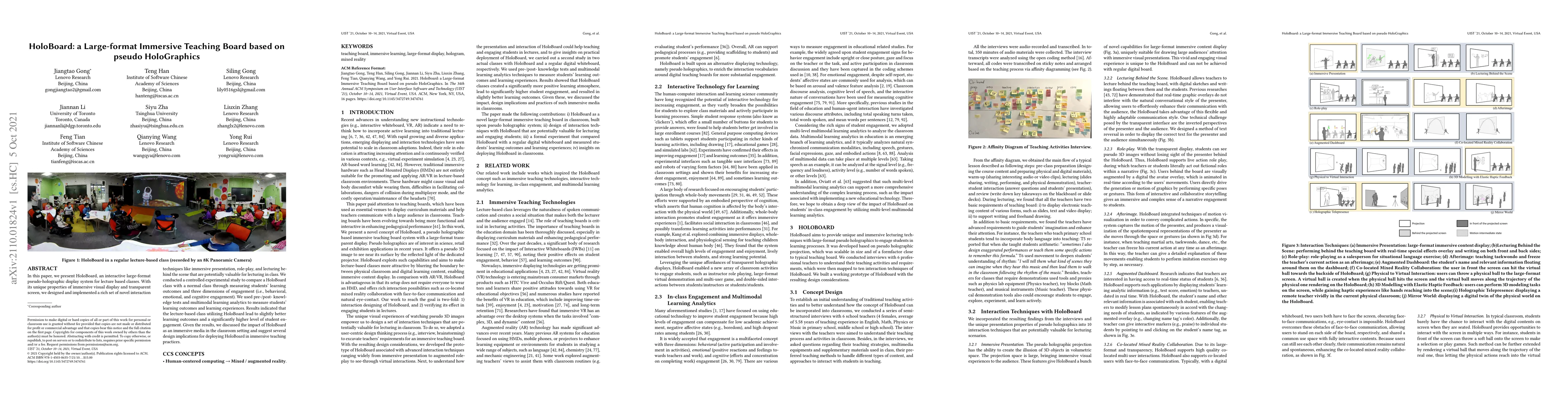 In this paper, we present HoloBoard, an interactive large-format pseudo-holographic display system for lecture-based classes. With its unique properties of immersive visual display and transparent screen, we designed and implemented a rich set of novel interaction techniques like immersive presentation, role-play, and lecturing behind the scene that is potentially valuable for lecturing in class. We conducted a controlled experimental study to compare a HoloBoard class with a normal class by measuring students' learning outcomes and three dimensions of engagement (i.e., behavioral, emotional, and cognitive engagement). We used pre-/post- knowledge tests and multimodal learning analytics to measure students' learning outcomes and learning experiences. Results indicated that the lecture-based class utilizing HoloBoard lead to slightly better learning outcomes and a significantly higher level of student engagement. Given the results, we discussed the impact of HoloBoard as an immersive media in the classroom setting and suggest several design implications for deploying HoloBoard in immersive teaching practices.