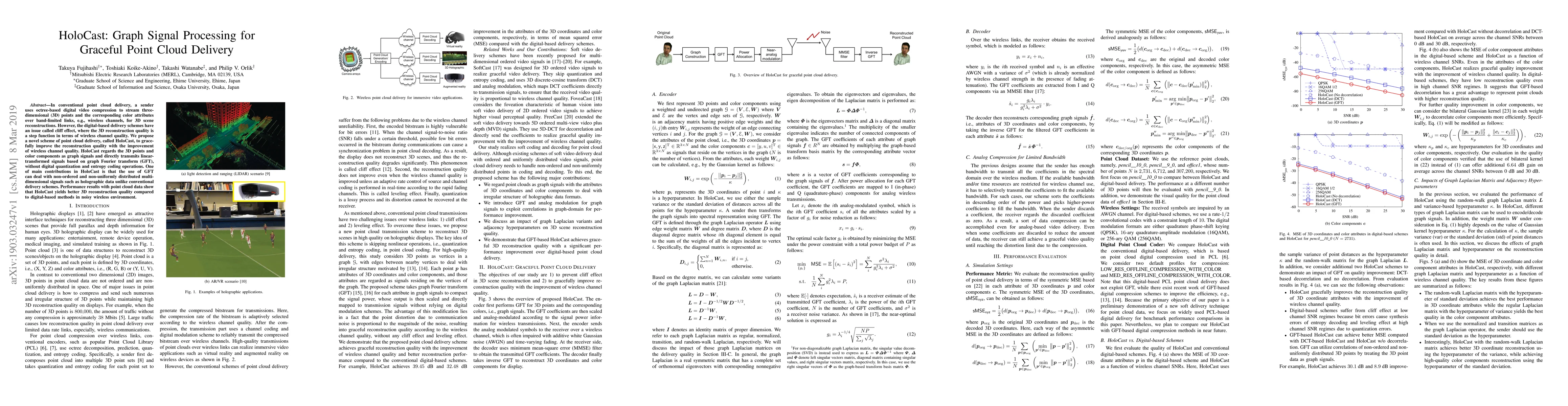 In conventional point cloud delivery, a sender uses octree-based digital video compression to stream three-dimensional (3D) points and the corresponding color attributes over band-limited links, e.g., wireless channels, for 3D scene reconstructions. However, the digital-based delivery schemes have an issue called cliff effect, where the 3D reconstruction quality is a step function in terms of wireless channel quality. We propose a novel scheme of point cloud delivery, called HoloCast, to gracefully improve the reconstruction quality with the improvement of wireless channel quality. HoloCast regards the 3D points and color components as graph signals and directly transmits linear-transformed signals based on graph Fourier transform (GFT), without digital quantization and entropy coding operations. One of main contributions in HoloCast is that the use of GFT can deal with non-ordered and non-uniformly distributed multi-dimensional signals such as holographic data unlike conventional delivery schemes. Performance results with point cloud data show that HoloCast yields better 3D reconstruction quality compared to digital-based methods in noisy wireless environment.