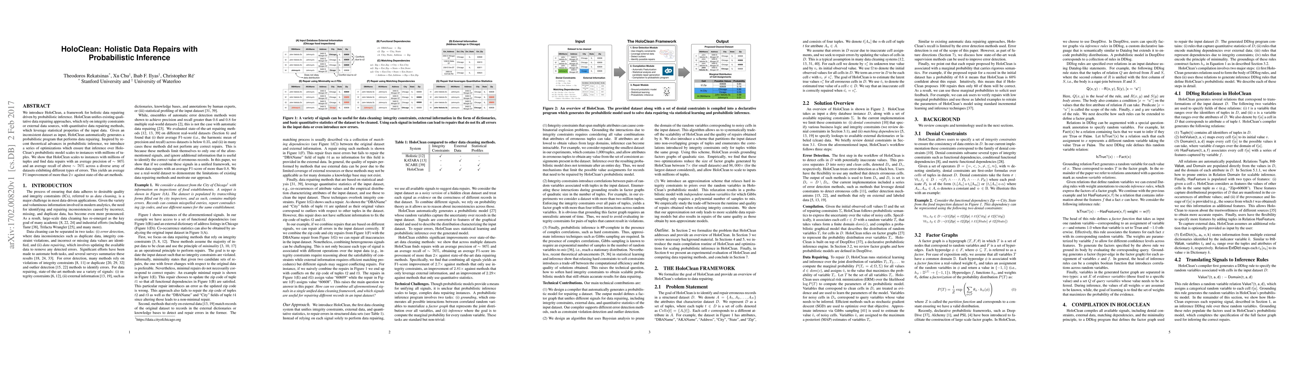 HoloClean is a framework that integrates qualitative and quantitative data repairing methods using probabilistic inference, achieving high precision and recall in repairing inconsistent datasets. It scales efficiently to large datasets and outperforms existing methods by more than twofold in F1 score.