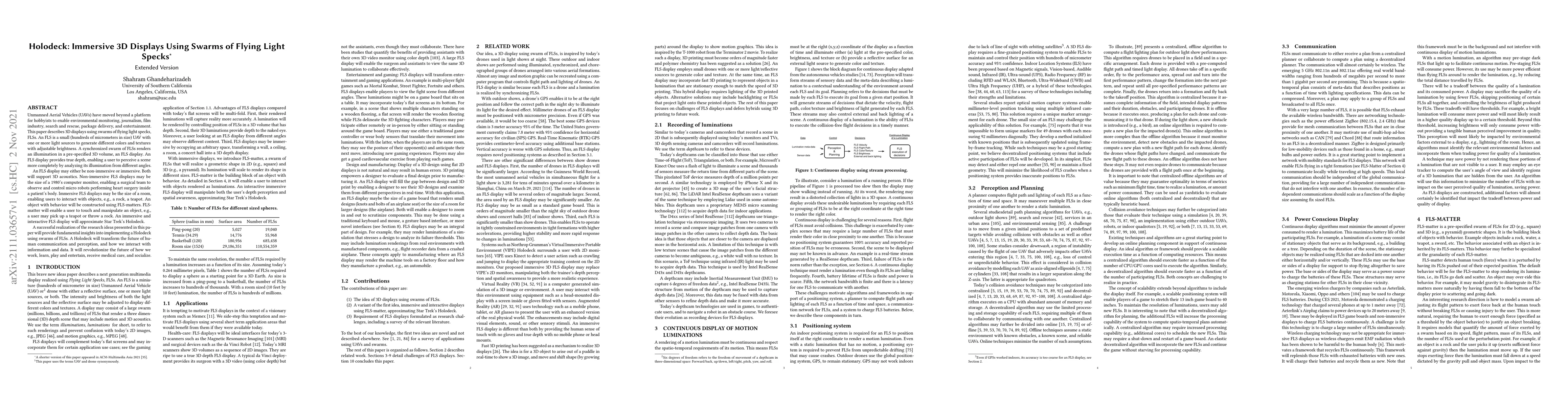 Unmanned Aerial Vehicles (UAVs) have moved beyond a platform for hobbyists to enable environmental monitoring, journalism, film industry, search and rescue, package delivery, and entertainment. This paper describes 3D displays using swarms of flying light specks, FLSs. An FLS is a small (hundreds of micrometers in size) UAV with one or more light sources to generate different colors and textures with adjustable brightness. A synchronized swarm of FLSs renders an illumination in a pre-specified 3D volume, an FLS display. An FLS display provides true depth, enabling a user to perceive a scene more completely by analyzing its illumination from different angles. An FLS display may either be non-immersive or immersive. Both will support 3D acoustics. Non-immersive FLS displays may be the size of a 1980's computer monitor, enabling a surgical team to observe and control micro robots performing heart surgery inside a patient's body. Immersive FLS displays may be the size of a room, enabling users to interact with objects, e.g., a rock, a teapot. An object with behavior will be constructed using FLS-matters. FLS-matter will enable a user to touch and manipulate an object, e.g., a user may pick up a teapot or throw a rock. An immersive and interactive FLS display will approximate Star Trek's Holodeck. A successful realization of the research ideas presented in this paper will provide fundamental insights into implementing a Holodeck using swarms of FLSs. A Holodeck will transform the future of human communication and perception, and how we interact with information and data. It will revolutionize the future of how we work, learn, play and entertain, receive medical care, and socialize.