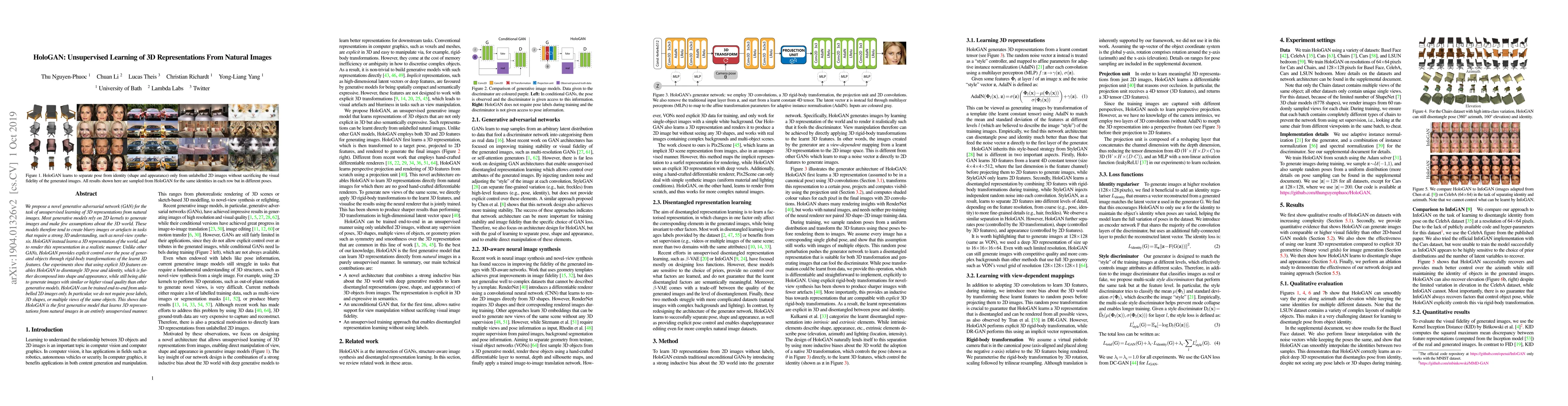 HoloGAN is the first generative model that learns 3D representations from natural images in an entirely unsupervised manner.