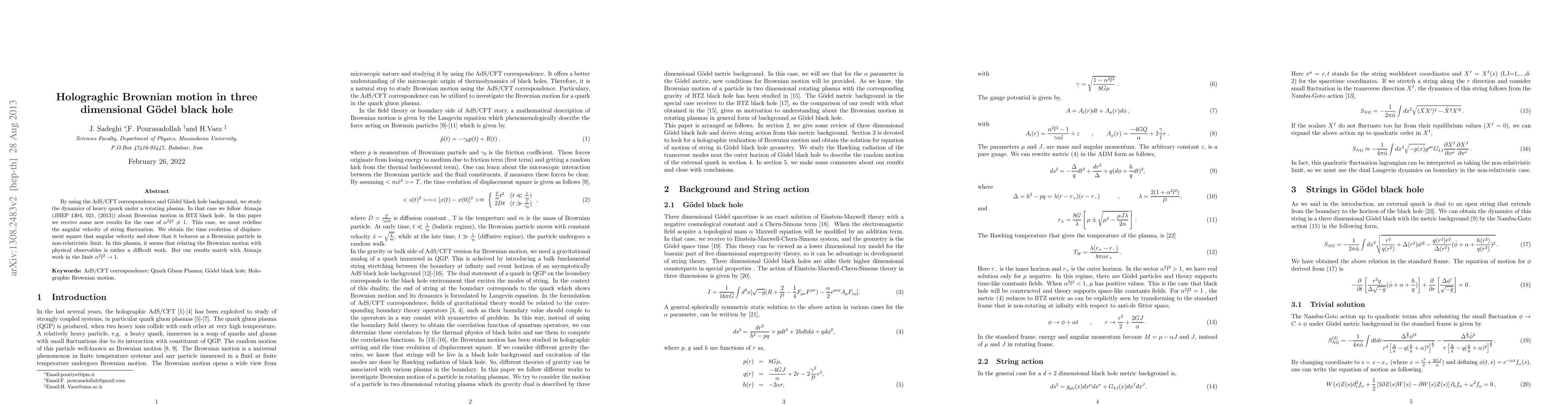 By using the AdS/CFT correspondence and G\"{o}del black hole background, we study the dynamics of heavy quark under a rotating plasma. In that case we follow Atmaja (JHEP 1304, 021, (2013)) about Brownian motion in BTZ black hole. In this paper we receive some new results for the case of $\alpha^{2}l^{2}\neq1$. This case, we must redefine the angular velocity of string fluctuation. We obtain the time evolution of displacement square that angular velocity and show that it behaves as a Brownian particle in non-relativistic limit. In this plasma, it seems that relating the Brownian motion with physical observables is rather a difficult work. But our results match with Atmaja work in the limit $\alpha^{2}l^{2}\rightarrow1$.