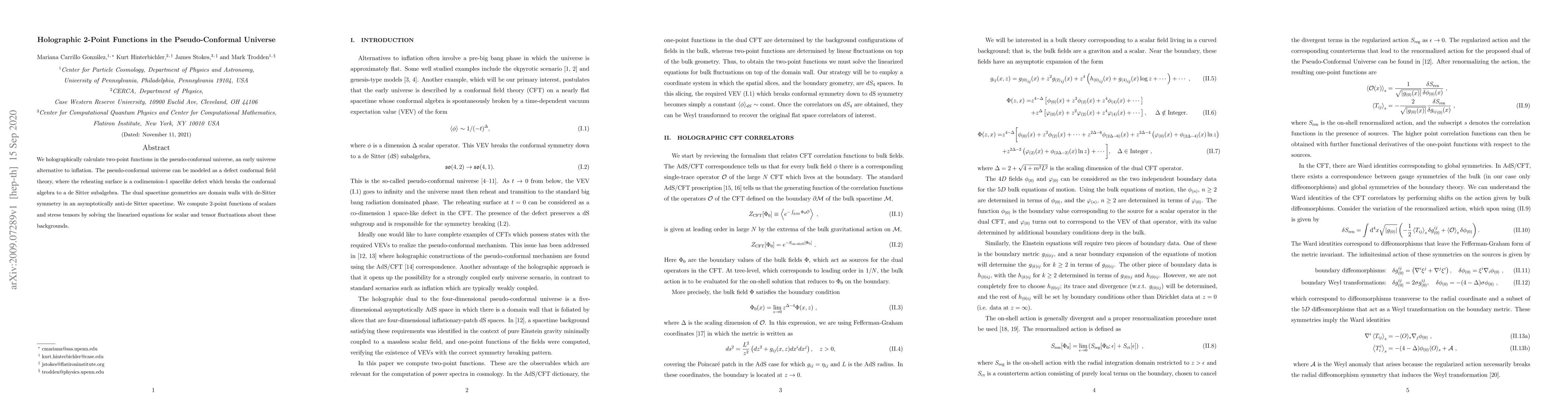 We holographically calculate two-point functions in the pseudo-conformal universe, an early universe alternative to inflation. The pseudo-conformal universe can be modeled as a defect conformal field theory, where the reheating surface is a codimension-1 spacelike defect which breaks the conformal algebra to a de Sitter subalgebra. The dual spacetime geometries are domain walls with de-Sitter symmetry in an asymptotically anti-de Sitter spacetime. We compute 2-point functions of scalars and stress tensors by solving the linearized equations for scalar and tensor fluctuations about these backgrounds.