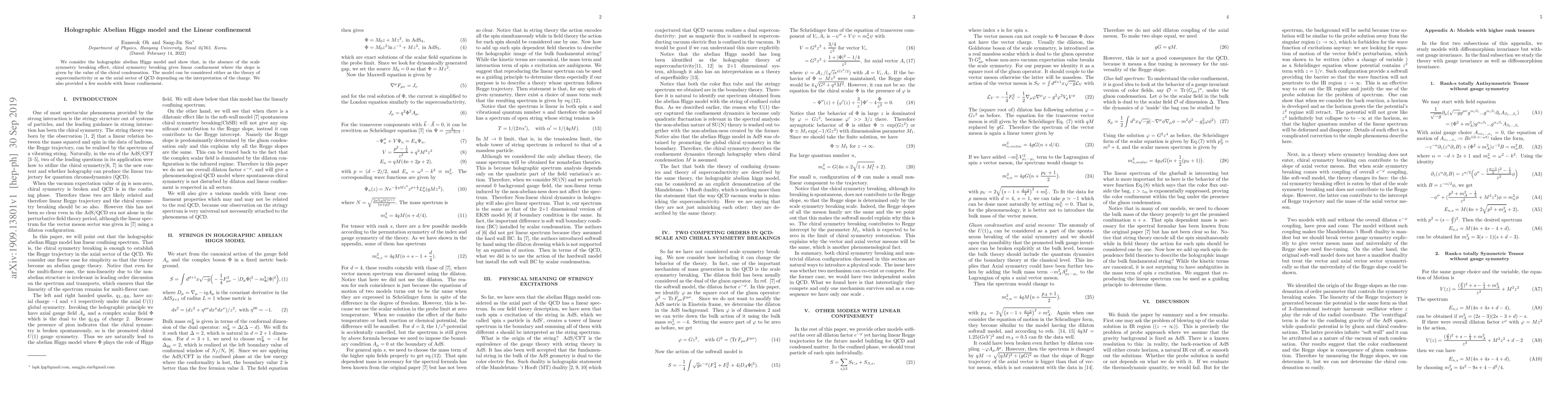 Summary: The paper explores the holographic abelian Higgs model to demonstrate linear confinement driven by chiral symmetry breaking, where the confinement slope correlates with chiral condensation. The model can represent superconductivity or the axial sector of QCD, depending on the charge interpretation.