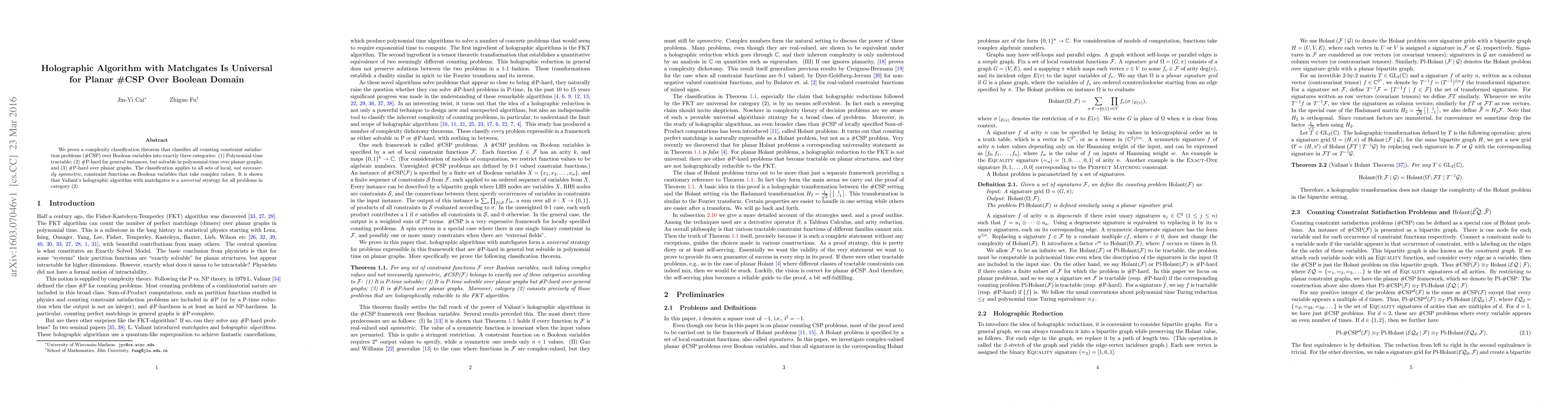 We prove a complexity classification theorem that classifies all counting constraint satisfaction problems ($\#$CSP) over Boolean variables into exactly three categories: (1) Polynomial-time tractable; (2) $\#$P-hard for general instances, but solvable in polynomial-time over planar graphs; and (3) $\#$P-hard over planar graphs. The classification applies to all sets of local, not necessarily symmetric, constraint functions on Boolean variables that take complex values. It is shown that Valiant's holographic algorithm with matchgates is a universal strategy for all problems in category (2).