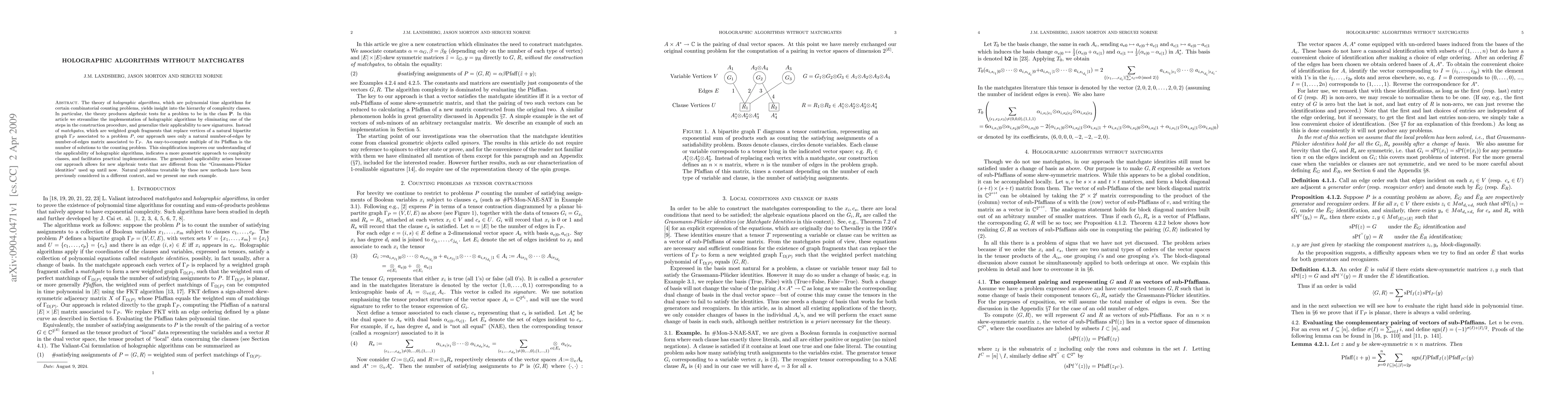 The theory of holographic algorithms, which are polynomial time algorithms for certain combinatorial counting problems, yields insight into the hierarchy of complexity classes. In particular, the theory produces algebraic tests for a problem to be in the class P. In this article we streamline the implementation of holographic algorithms by eliminating one of the steps in the construction procedure, and generalize their applicability to new signatures. Instead of matchgates, which are weighted graph fragments that replace vertices of a natural bipartite graph G associated to a problem P, our approach uses only only a natural number-of-edges by number-of-edges matrix associated to G. An easy-to-compute multiple of its Pfaffian is the number of solutions to the counting problem. This simplification improves our understanding of the applicability of holographic algorithms, indicates a more geometric approach to complexity classes, and facilitates practical implementations. The generalized applicability arises because our approach allows for new algebraic tests that are different from the "Grassmann-Plucker identities" used up until now. Natural problems treatable by these new methods have been previously considered in a different context, and we present one such example.