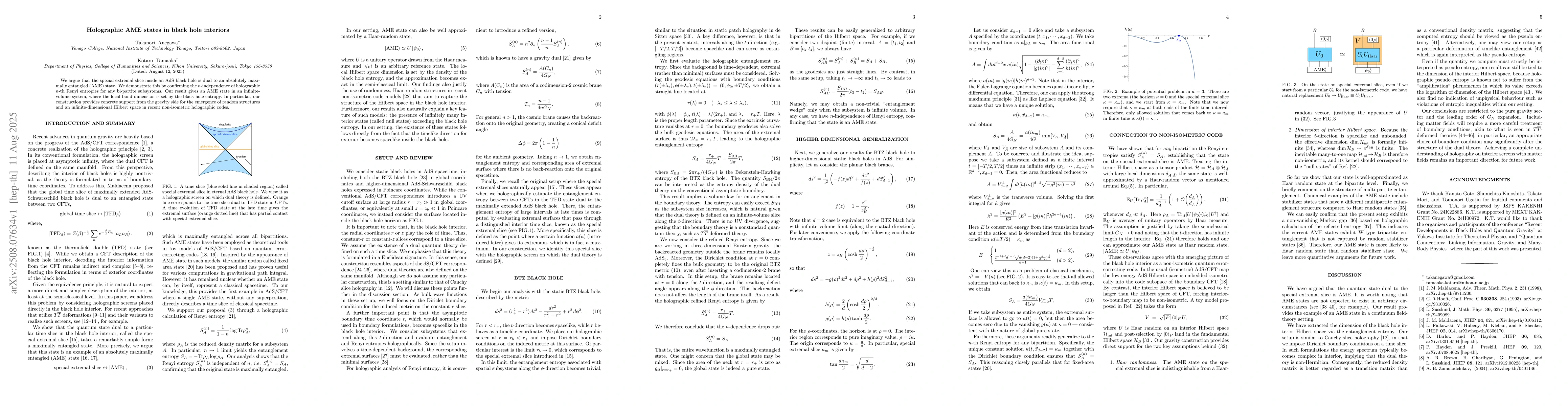 We argue that the special extremal slice inside an AdS black hole is dual to an absolutely maximally entangled (AME) state. We demonstrate this by confirming the $n$-independence of holographic $n$-th Renyi entropies for any bi-partite subsystems. Our result gives an AME state in an infinite-volume system, where the local bond dimension is set by the black hole entropy. In particular, our construction provides concrete support from the gravity side for the emergence of random structures and an infinite-dimensional Hilbert space in recent non-isometric holographic codes.