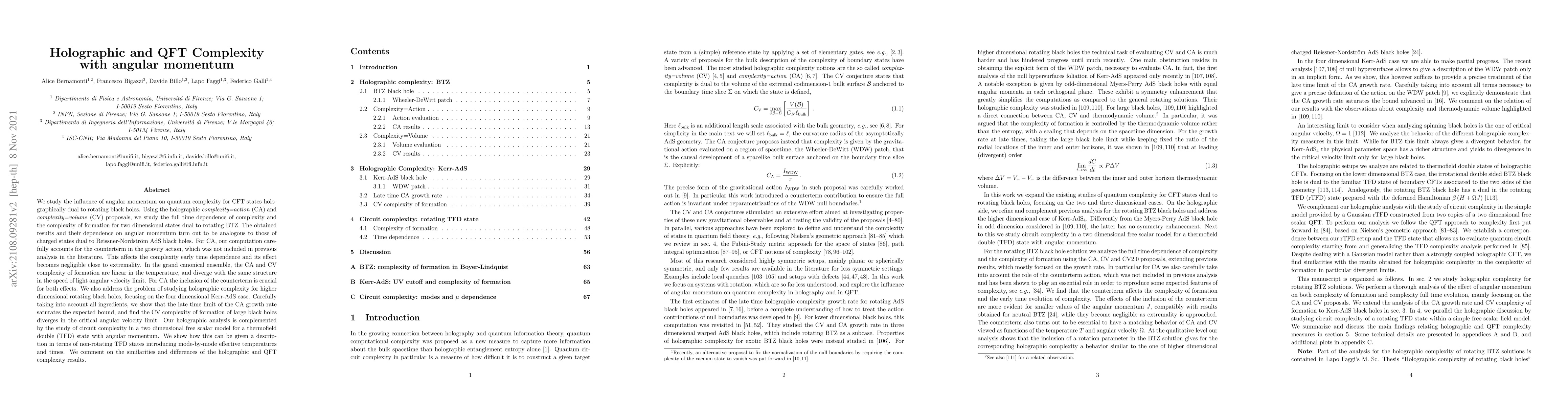 We study the influence of angular momentum on quantum complexity for CFT states holographically dual to rotating black holes. Using the holographic complexity=action (CA) and complexity=volume (CV) proposals, we study the full time dependence of complexity and the complexity of formation for two dimensional states dual to rotating BTZ. The obtained results and their dependence on angular momentum turn out to be analogous to those of charged states dual to Reissner-Nordstr\"om AdS black holes. For CA, our computation carefully accounts for the counterterm in the gravity action, which was not included in previous analysis in the literature. This affects the complexity early time dependence and its effect becomes negligible close to extremality. In the grand canonical ensemble, the CA and CV complexity of formation are linear in the temperature, and diverge with the same structure in the speed of light angular velocity limit. For CA the inclusion of the counterterm is crucial for both effects. We also address the problem of studying holographic complexity for higher dimensional rotating black holes, focusing on the four dimensional Kerr-AdS case. Carefully taking into account all ingredients, we show that the late time limit of the CA growth rate saturates the expected bound, and find the CV complexity of formation of large black holes diverges in the critical angular velocity limit. Our holographic analysis is complemented by the study of circuit complexity in a two dimensional free scalar model for a thermofield double (TFD) state with angular momentum. We show how this can be given a description in terms of non-rotating TFD states introducing mode-by-mode effective temperatures and times. We comment on the similarities and differences of the holographic and QFT complexity results.