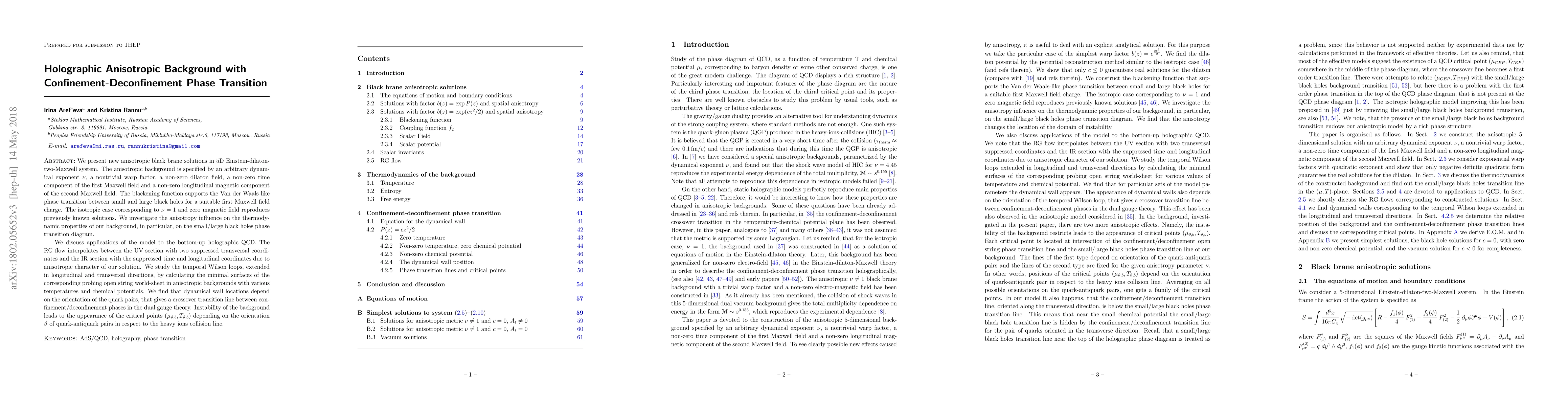 We present new anisotropic black brane solutions in 5D Einstein-dilaton-two-Maxwell system. The anisotropic background is specified by an arbitrary dynamical exponent $\nu$, a nontrivial warp factor, a non-zero dilaton field, a non-zero time component of the first Maxwell field and a non-zero longitudinal magnetic component of the second Maxwell field. The blackening function supports the Van der Waals-like phase transition between small and large black holes for a suitable first Maxwell field charge. The isotropic case corresponding to $\nu = 1$ and zero magnetic field reproduces previously known solutions. We investigate the anisotropy influence on the thermodynamic properties of our background, in particular, on the small/large black holes phase transition diagram. We discuss applications of the model to the bottom-up holographic QCD. The RG flow interpolates between the UV section with two suppressed transversal coordinates and the IR section with the suppressed time and longitudinal coordinates due to anisotropic character of our solution. We study the temporal Wilson loops, extended in longitudinal and transversal directions, by calculating the minimal surfaces of the corresponding probing open string world-sheet in anisotropic backgrounds with various temperatures and chemical potentials. We find that dynamical wall locations depend on the orientation of the quark pairs, that gives a crossover transition line between confinement/deconfinement phases in the dual gauge theory. Instability of the background leads to the appearance of the critical points $(\mu_{\vartheta,b}, T_{\vartheta,b})$ depending on the orientation $\vartheta$ of quark-antiquark pairs in respect to the heavy ions collision line.
