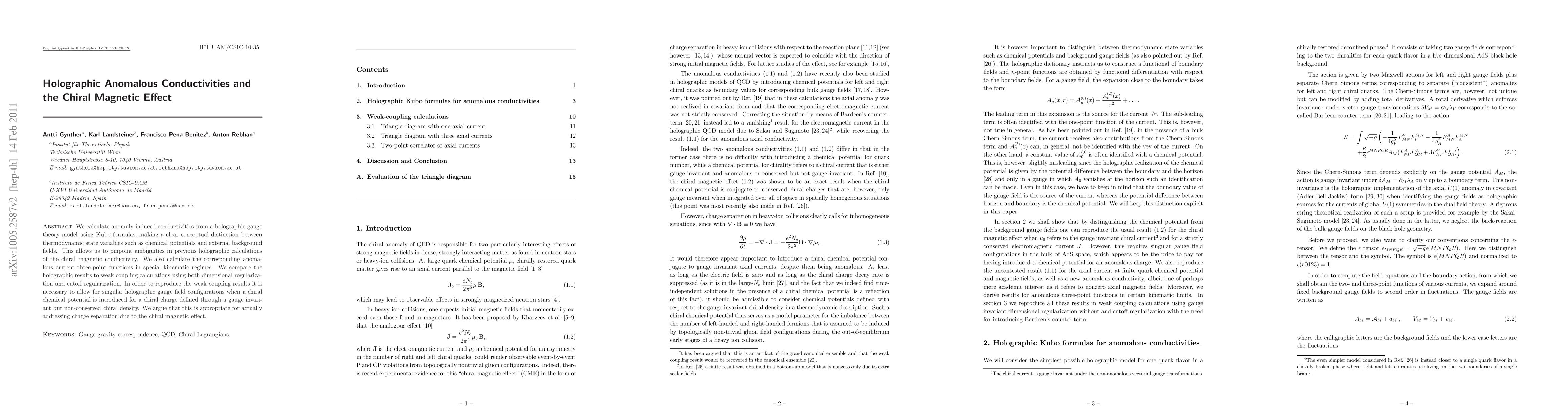 We calculate anomaly induced conductivities from a holographic gauge theory model using Kubo formulas, making a clear conceptual distinction between thermodynamic state variables such as chemical potentials and external background fields. This allows us to pinpoint ambiguities in previous holographic calculations of the chiral magnetic conductivity. We also calculate the corresponding anomalous current three-point functions in special kinematic regimes. We compare the holographic results to weak coupling calculations using both dimensional regularization and cutoff regularization. In order to reproduce the weak coupling results it is necessary to allow for singular holographic gauge field configurations when a chiral chemical potential is introduced for a chiral charge defined through a gauge invariant but non-conserved chiral density. We argue that this is appropriate for actually addressing charge separation due to the chiral magnetic effect.
