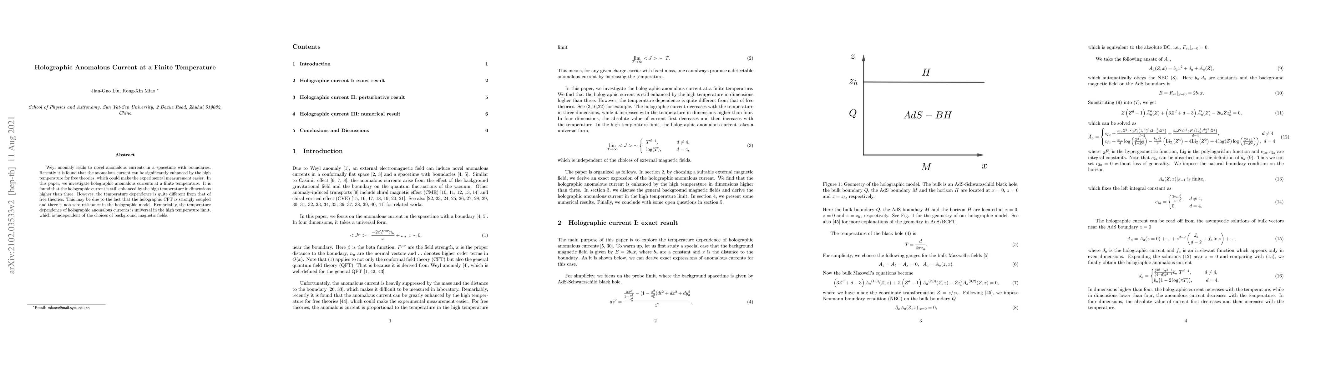 This paper explores holographic anomalous currents at finite temperatures, finding that while high temperatures enhance these currents in dimensions greater than three, the temperature dependence differs from that in free theories due to the strongly coupled nature of holographic CFTs. The temperature dependence is universal in the high temperature limit, regardless of background magnetic fields.
