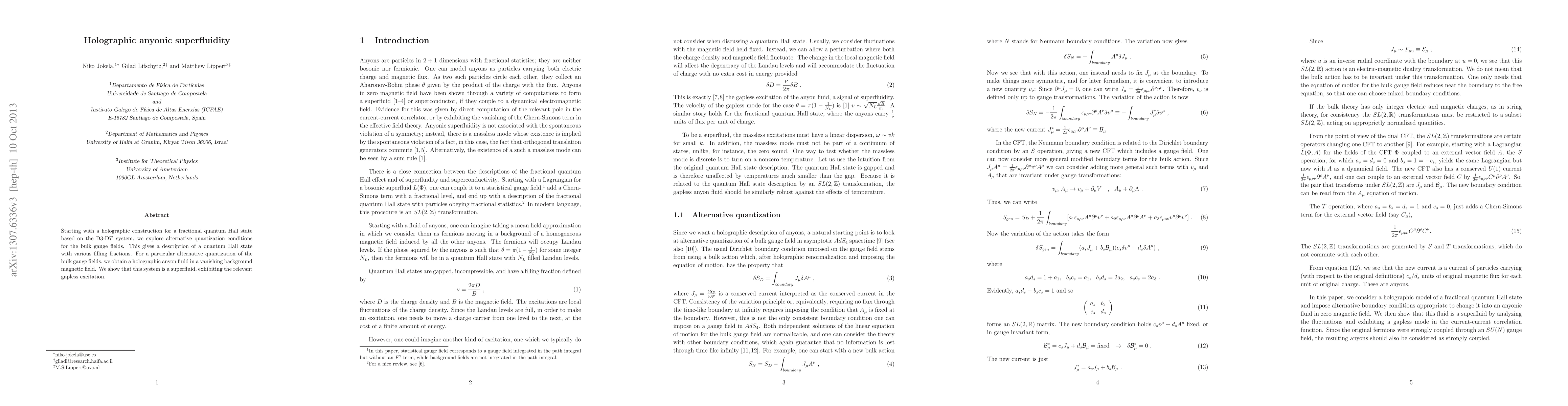 Starting with a holographic construction for a fractional quantum Hall state based on the D3-D7' system, we explore alternative quantization conditions for the bulk gauge fields. This gives a description of a quantum Hall state with various filling fractions. For a particular alternative quantization of the bulk gauge fields, we obtain a holographic anyon fluid in a vanishing background magnetic field. We show that this system is a superfluid, exhibiting the relevant gapless excitation.
