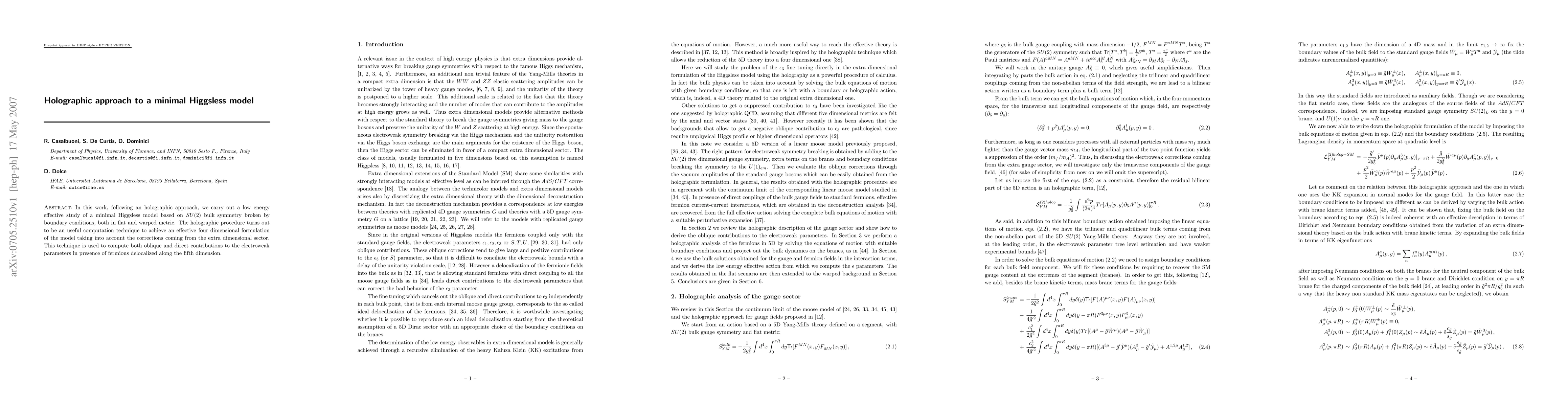 This paper employs an holographic approach to study a minimal Higgsless model based on SU(2) symmetry, analyzing both flat and warped metrics. The method effectively computes electroweak parameters, incorporating corrections from extra dimensions and contributions from fermions distributed along the fifth dimension.