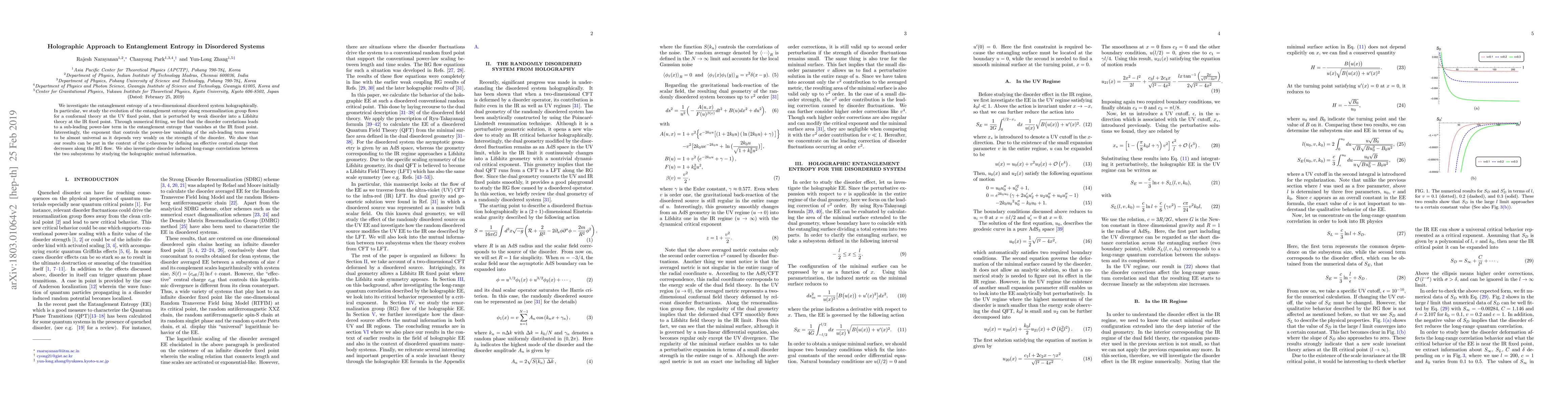 We investigate the entanglement entropy of a two-dimensional disordered system holographically. In particular, we study the evolution of the entanglement entropy along renormalization group flows for a conformal theory at the UV fixed point, that is perturbed by weak disorder into a Lifshitz theory at the IR fixed point. Through numerical fitting, we find that the disorder correlations leads to a sub-leading power-law term in the entanglement entropy that vanishes at the IR fixed point. Interestingly, the exponent that controls the power-law vanishing of the sub-leading term seems to be almost universal as it depends very weakly on the strength of the disorder. We show that our results can be put in the context of the c-theorem by defining an effective central charge that decreases along the RG flow. We also investigate disorder induced long-range correlations between the two subsystems by studying the holographic mutual information.