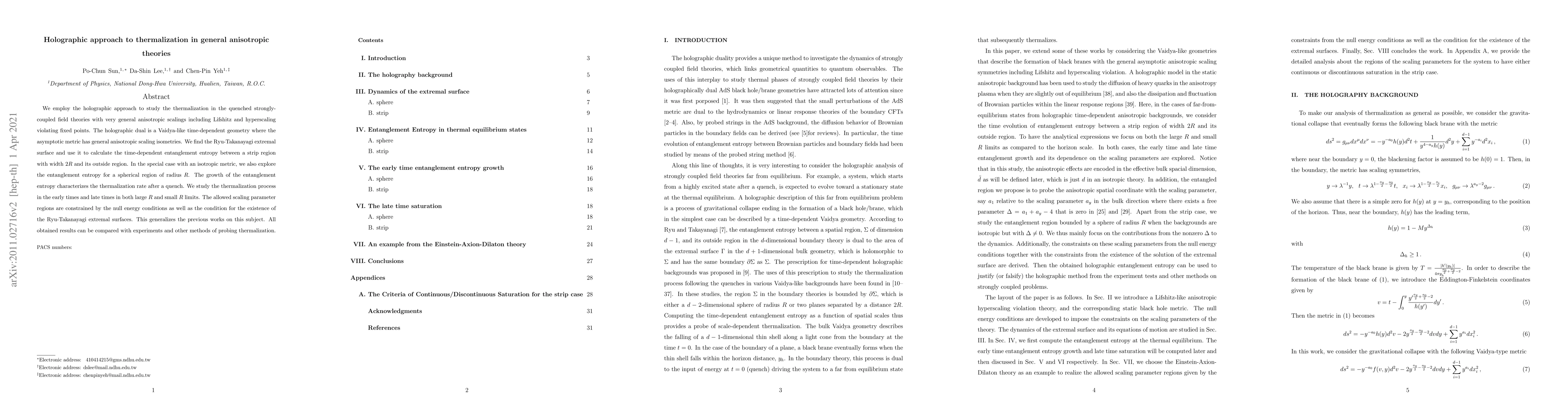This paper uses the holographic approach to investigate thermalization in strongly-coupled, anisotropic field theories, including Lifshitz and hyperscaling violating cases. It employs a Vaidya-like geometry to calculate time-dependent entanglement entropy, characterizing thermalization rates in different scaling regions constrained by energy conditions.