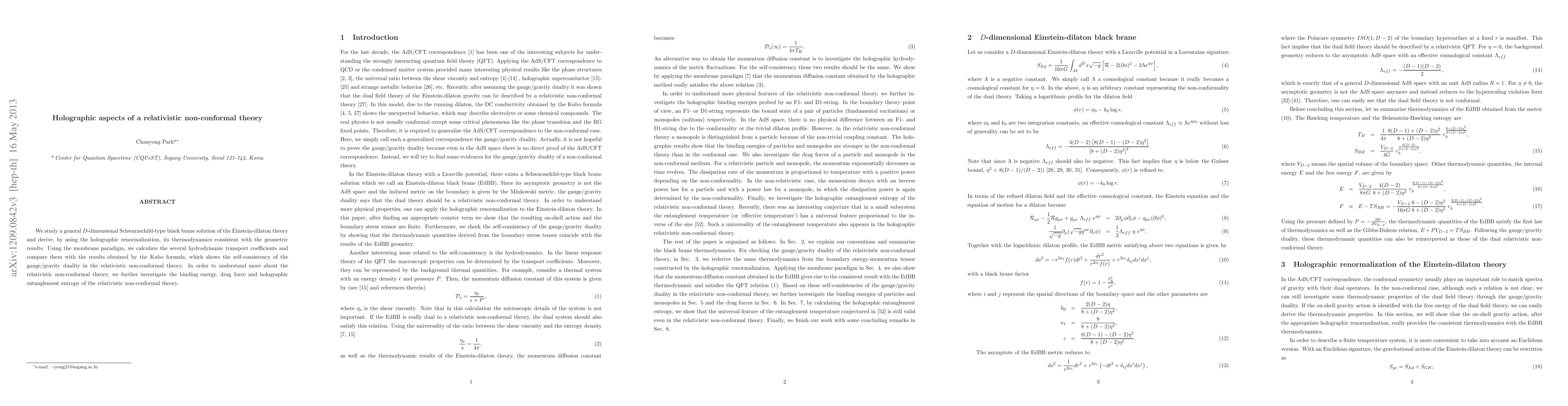 We study a general D-dimensional Schwarzschild-type black brane solution of the Einstein-dilaton theory and derive, by using the holographic renormalization, its thermodynamics consistent with the geometric results. Using the membrane paradigm, we calculate the several hydrodynamic transport coefficients and compare them with the results obtained by the Kubo formula, which shows the self-consistency of the gauge/gravity duality in the relativistic non-conformal theory. In order to understand more about the relativistic non-conformal theory, we further investigate the binding energy, drag force and holographic entanglement entropy of the relativistic non-conformal theory.