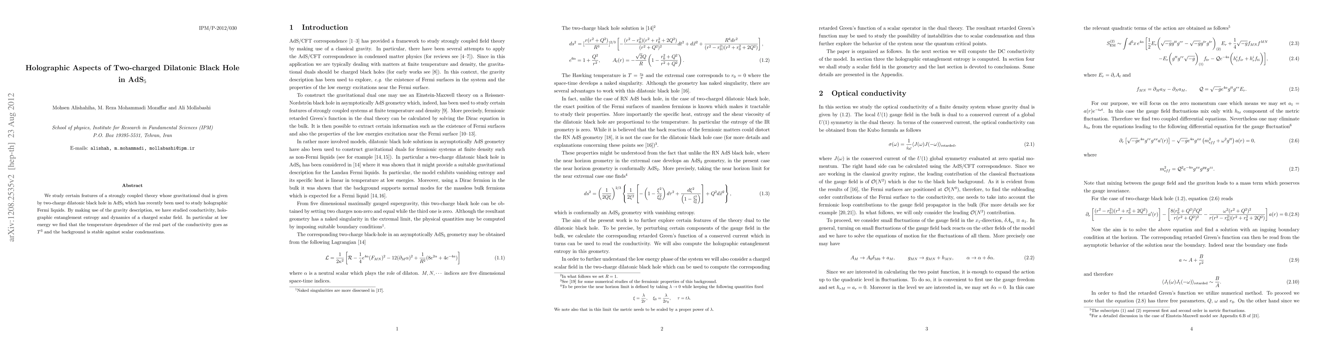 This paper investigates a strongly coupled theory via its gravitational dual, a two-charge dilatonic black hole in AdS5, focusing on holographic Fermi liquids. It examines conductivity, holographic entanglement entropy, and dynamics of a charged scalar field, finding a T^3 temperature dependence for the real part of conductivity and stability against scalar condensations.