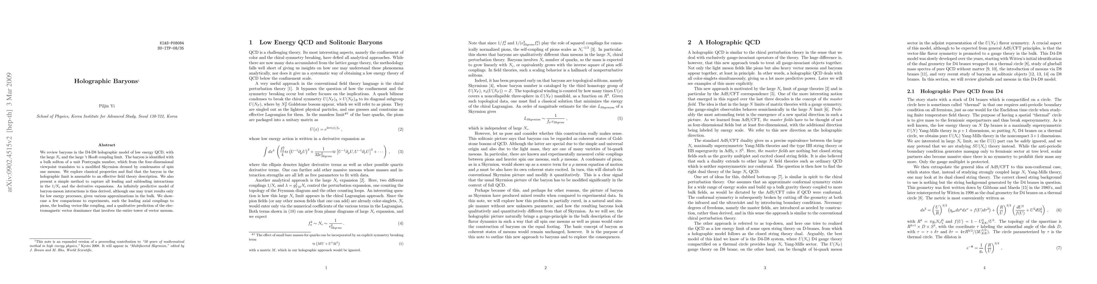 We review baryons in the D4-D8 holographic model of low energy QCD, with the large $N_c$ and the large 't Hooft coupling limit. The baryon is identified with a bulk soliton of a unit Pontryagin number, which from the four-dimensional viewpoint translates to a heavily modified Skyrmion dressed by condensates of spin one mesons. We explore classical properties and find that the baryon in the holographic limit is amenable to an effective field theory description. We also present a simple method to capture all leading and subleading interactions in the $1/N_c$ and the derivative expansions. An infinitely predictive model of baryon-meson interactions is thus derived, although one may trust results only for low energy processes, given various approximations in the bulk. We showcase a few comparisons to experiments, such the leading axial couplings to pions, the leading vector-like coupling, and a qualitative prediction of the electromagnetic vector dominance that involves the entire tower of vector mesons. (This article is an expanded version of a proceeding contribution to "30 years of mathematical method in high energy physics," Kyoto 2008)