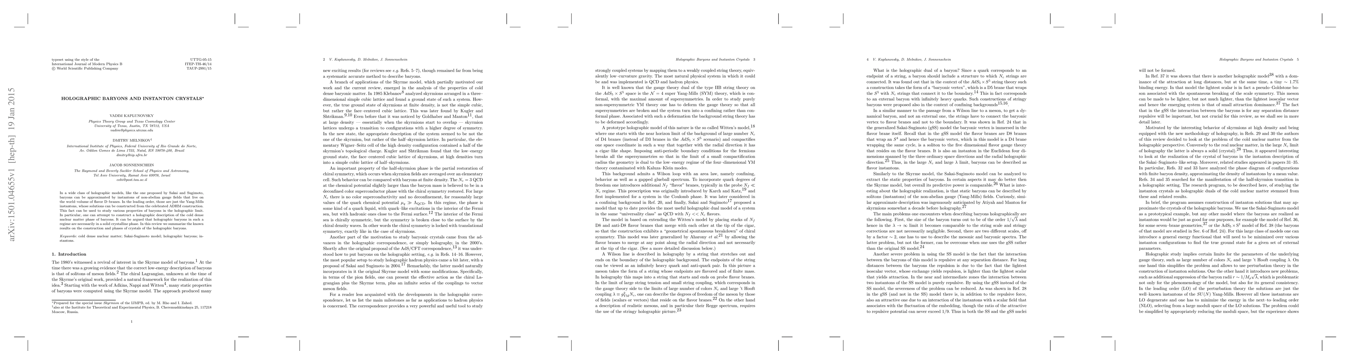 This paper reviews holographic baryons in the Sakai-Sugimoto model, where baryons are approximated by Yang-Mills instantons on flavor D-branes. It explores the crystalline phase of cold dense nuclear matter, demonstrating that holographic baryons form instanton crystals in such regimes.