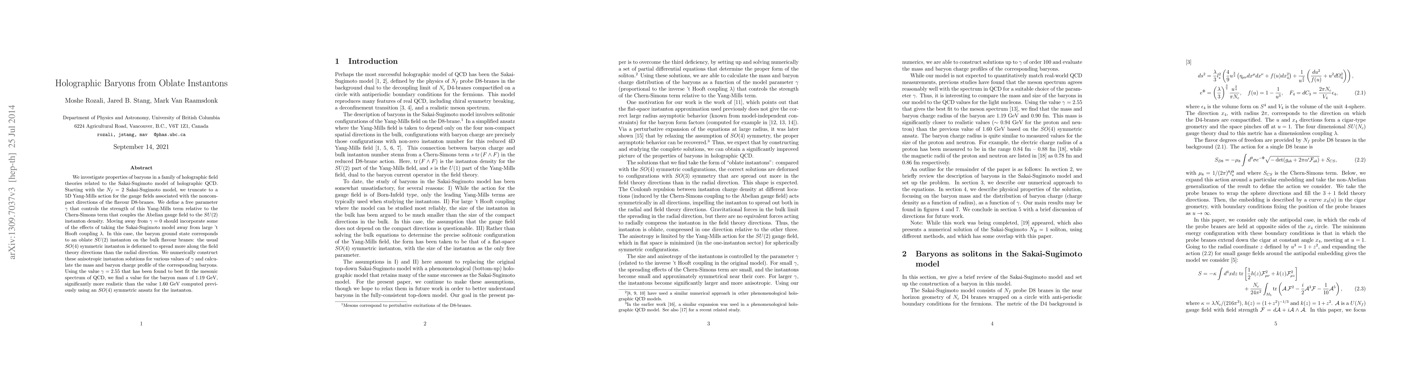 This paper explores baryon properties in a holographic QCD model, focusing on oblate SU(2) instantons derived from the Sakai-Sugimoto model. It finds that adjusting a parameter $\gamma$ leads to a more realistic baryon mass of 1.19 GeV compared to the previously computed 1.60 GeV.