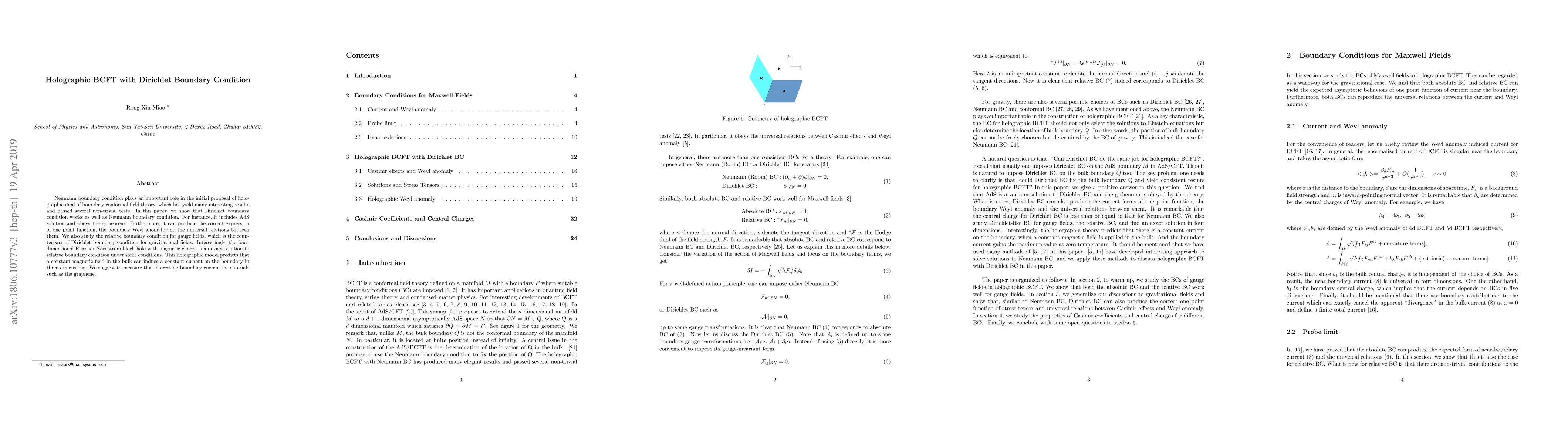 This paper explores the holographic boundary conformal field theory (BCFT) with Dirichlet boundary conditions, demonstrating its equivalence to the Neumann boundary condition. It shows that this model accurately predicts AdS solutions, obeys the g-theorem, and correctly expresses one-point functions and boundary Weyl anomalies. Additionally, it identifies a four-dimensional Reissner-Nordstrom black hole as an exact solution under certain conditions and predicts a bulk magnetic field can induce a boundary current, suggesting potential experimental verification in materials like graphene.