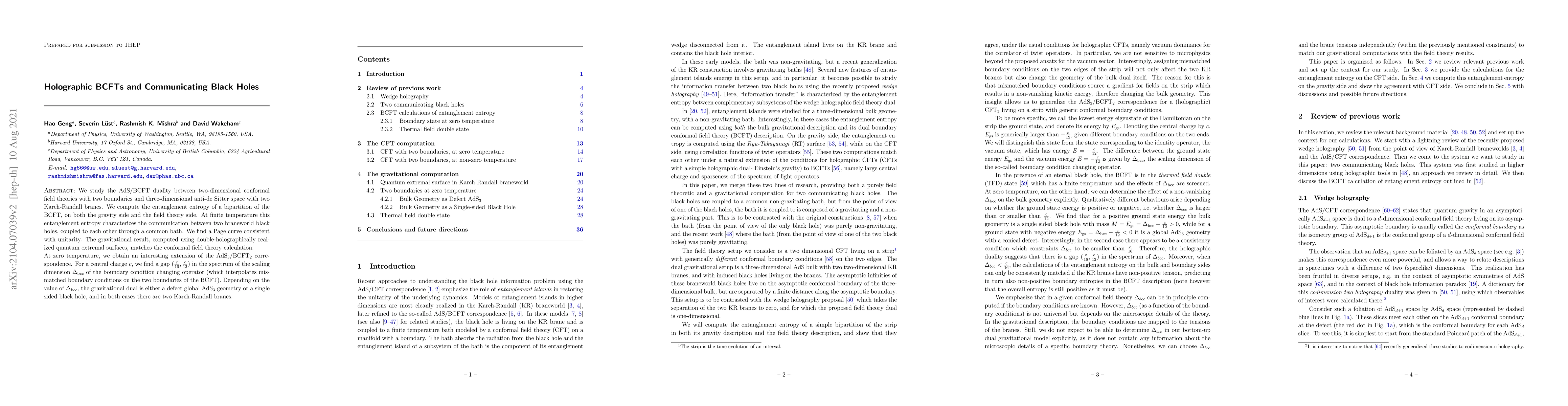 Researchers study the AdS/BCFT duality to understand communication between black holes in a 2D conformal field theory with 3D anti-de Sitter space, finding a consistent Page curve and a gap in the spectrum of a boundary condition changing operator.