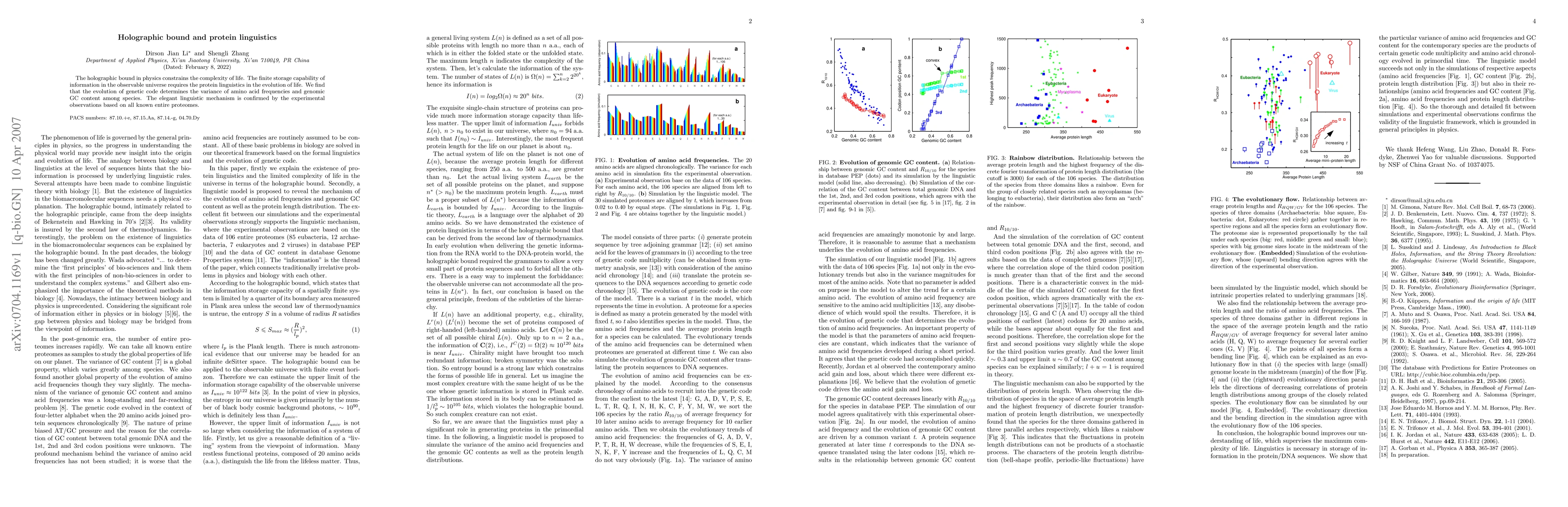 The holographic bound in physics constrains the complexity of life. The finite storage capability of information in the observable universe requires the protein linguistics in the evolution of life. We find that the evolution of genetic code determines the variance of amino acid frequencies and genomic GC content among species. The elegant linguistic mechanism is confirmed by the experimental observations based on all known entire proteomes.