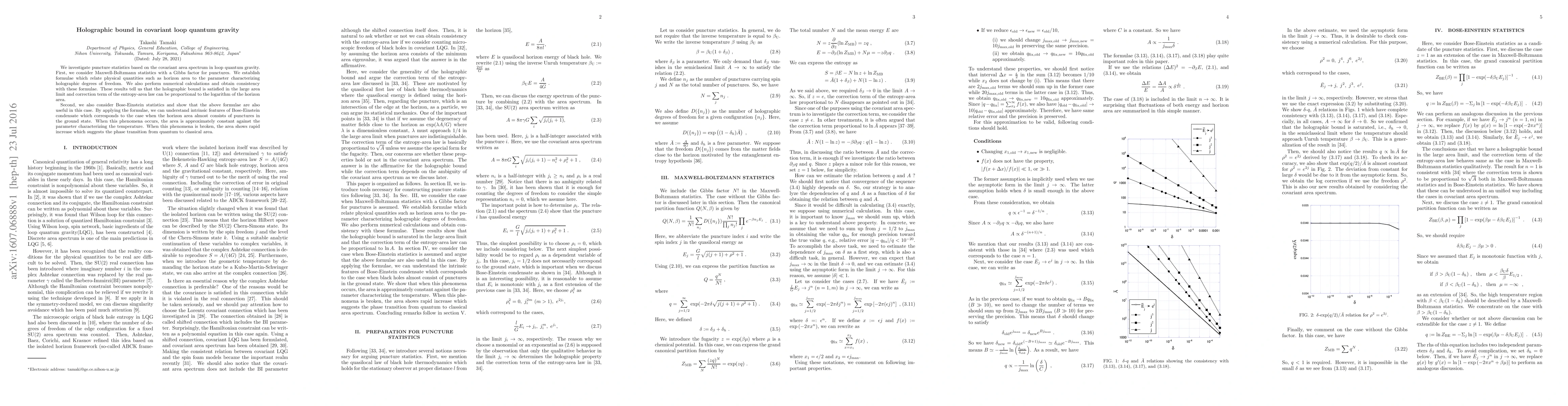 We investigate puncture statistics based on the covariant area spectrum in loop quantum gravity. First, we consider Maxwell-Boltzmann statistics with a Gibbs factor for punctures. We establish formulae which relate physical quantities such as horizon area to the parameter characterizing holographic degrees of freedom. We also perform numerical calculations and obtain consistency with these formulae. These results tell us that the holographic bound is satisfied in the large area limit and correction term of the entropy-area law can be proportional to the logarithm of the horizon area. Second, we also consider Bose-Einstein statistics and show that the above formulae are also useful in this case. By applying the formulae, we can understand intrinsic features of Bose-Einstein condensate which corresponds to the case when the horizon area almost consists of punctures in the ground state. When this phenomena occurs, the area is approximately constant against the parameter characterizing the temperature. When this phenomena is broken, the area shows rapid increase which suggests the phase transition from quantum to classical area.