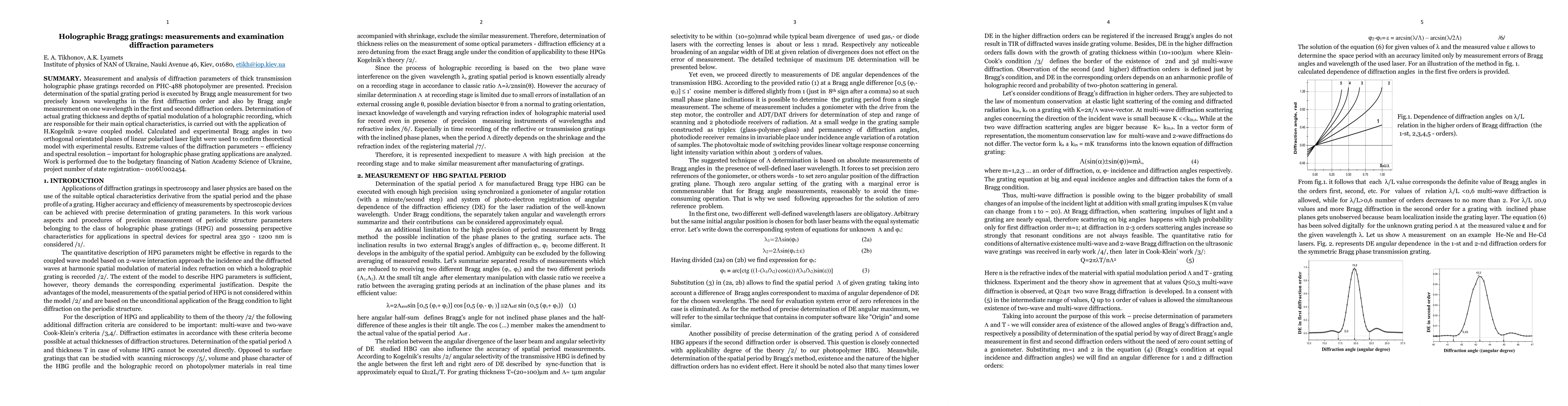 This paper measures and analyzes diffraction parameters of thick holographic phase gratings on PHC-488 photopolymer, determining spatial grating periods using Bragg angles for multiple diffraction orders and confirming theoretical models with experimental results. It also assesses the efficiency and spectral resolution crucial for holographic phase grating applications.