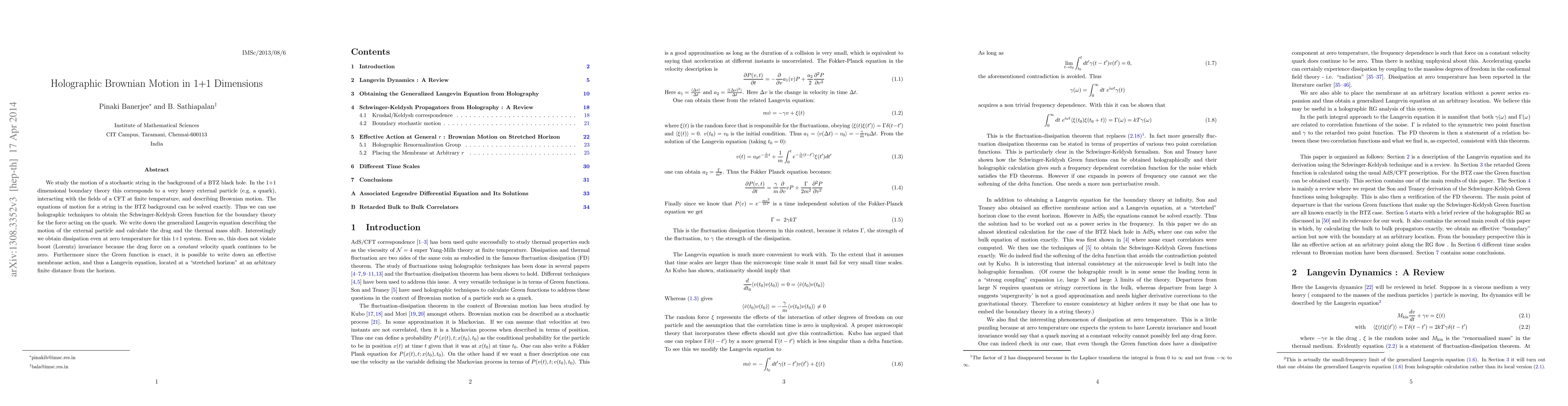 We study the motion of a stochastic string in the background of a BTZ black hole. In the 1+1 dimensional boundary theory this corresponds to a very heavy external particle (e.g, a quark), interacting with the fields of a CFT at finite temperature, and describing Brownian motion. The equations of motion for a string in the BTZ background can be solved exactly. Thus we can use holographic techniques to obtain the Schwinger-Keldysh Green function for the boundary theory for the force acting on the quark. We write down the generalized Langevin equation describing the motion of the external particle and calculate the drag and the thermal mass shift. Interestingly we obtain dissipation even at zero temperature for this 1+1 system. Even so, this does not violate boost (Lorentz) invariance because the drag force on a constant velocity quark continues to be zero. Furthermore since the Green function is exact, it is possible to write down an effective membrane action, and thus a Langevin equation, located at a "stretched horizon" at an arbitrary finite distance from the horizon.