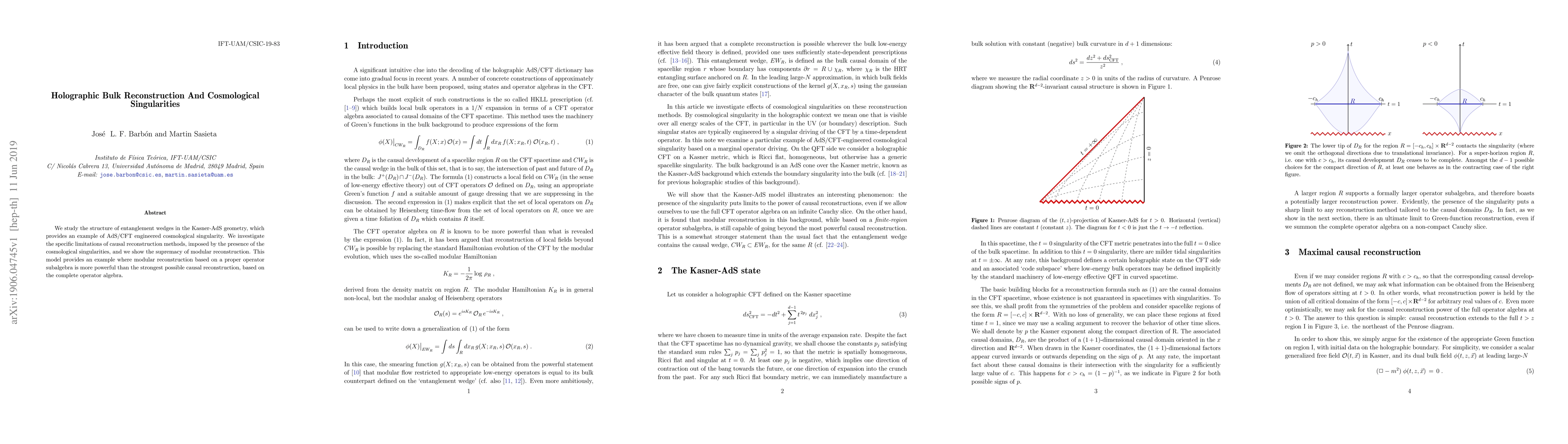 We study the structure of entanglement wedges in the Kasner-AdS geometry, which provides an example of AdS/CFT engineered cosmological singularity. We investigate the specific limitations of causal reconstruction methods, imposed by the presence of the cosmological singularities, and we show the supremacy of modular reconstruction. This model provides an example where modular reconstruction based on a proper operator subalgebra is more powerful than the strongest possible causal reconstruction, based on the complete operator algebra.