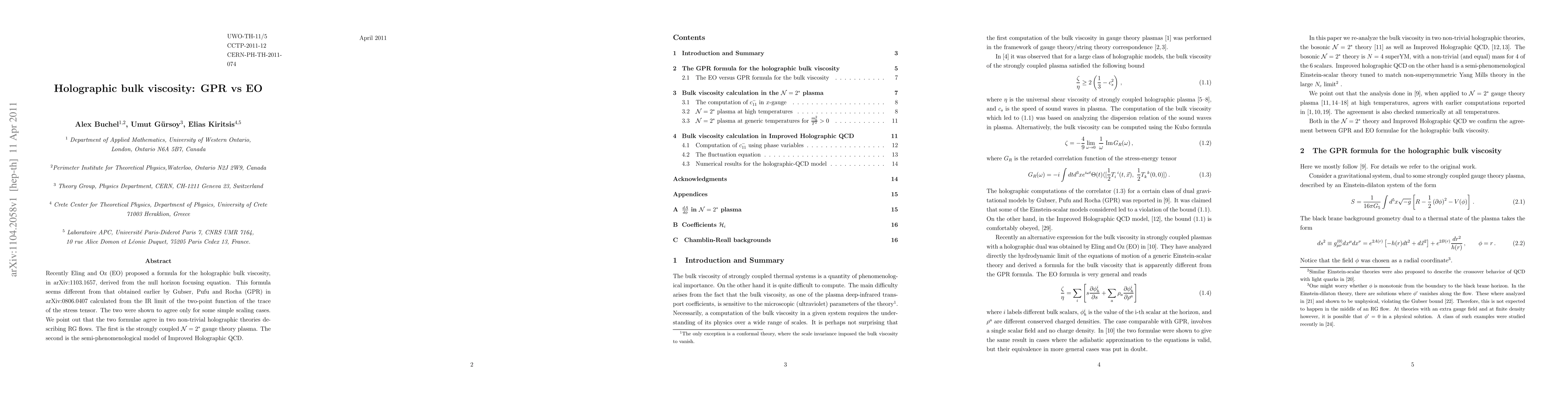 Recently Eling and Oz (EO) proposed a formula for the holographic bulk viscosity, in arXiv:1103.1657, derived from the null horizon focusing equation. This formula seems different from that obtained earlier by Gubser, Pufu and Rocha (GPR) in arXiv:0806.0407 calculated from the IR limit of the two-point function of the trace of the stress tensor. The two were shown to agree only for some simple scaling cases. We point out that the two formulae agree in two non-trivial holographic theories describing RG flows. The first is the strongly coupled N=2* gauge theory plasma. The second is the semi-phenomenological model of Improved Holographic QCD.