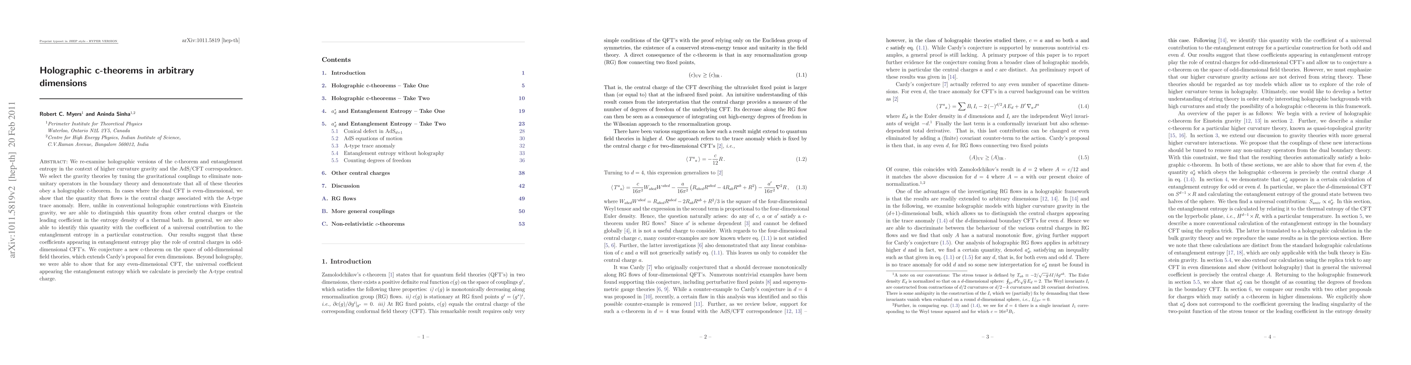 We re-examine holographic versions of the c-theorem and entanglement entropy in the context of higher curvature gravity and the AdS/CFT correspondence. We select the gravity theories by tuning the gravitational couplings to eliminate non-unitary operators in the boundary theory and demonstrate that all of these theories obey a holographic c-theorem. In cases where the dual CFT is even-dimensional, we show that the quantity that flows is the central charge associated with the A-type trace anomaly. Here, unlike in conventional holographic constructions with Einstein gravity, we are able to distinguish this quantity from other central charges or the leading coefficient in the entropy density of a thermal bath. In general, we are also able to identify this quantity with the coefficient of a universal contribution to the entanglement entropy in a particular construction. Our results suggest that these coefficients appearing in entanglement entropy play the role of central charges in odd-dimensional CFT's. We conjecture a new c-theorem on the space of odd-dimensional field theories, which extends Cardy's proposal for even dimensions. Beyond holography, we were able to show that for any even-dimensional CFT, the universal coefficient appearing the entanglement entropy which we calculate is precisely the A-type central charge.