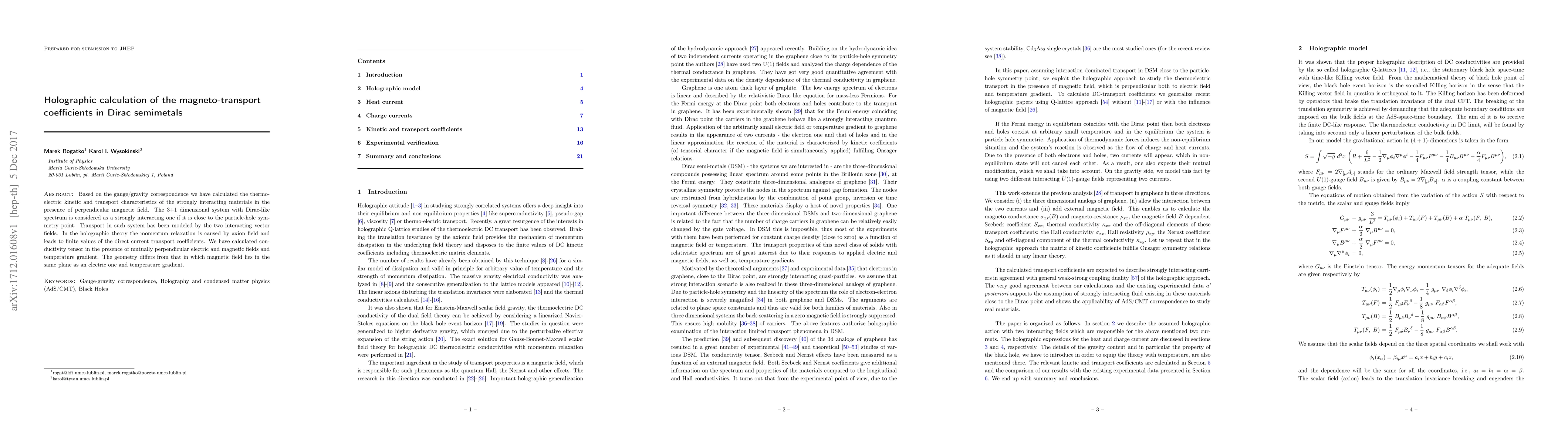 Based on the gauge/gravity correspondence we have calculated the thermoelectric kinetic and transport characteristics of the strongly interacting materials in the presence of perpendicular magnetic field. The 3+1 dimensional system with Dirac-like spectrum is considered as a strongly interacting one if it is close to the particle-hole symmetry point. Transport in such system has been modeled by the two interacting vector fields. In the holographic theory the momentum relaxation is caused by axion field and leads to finite values of the direct current transport coefficients. We have calculated conductivity tensor in the presence of mutually perpendicular electric and magnetic fields and temperature gradient. The geometry differs from that in which magnetic field lies in the same plane as an electric one and temperature gradient.