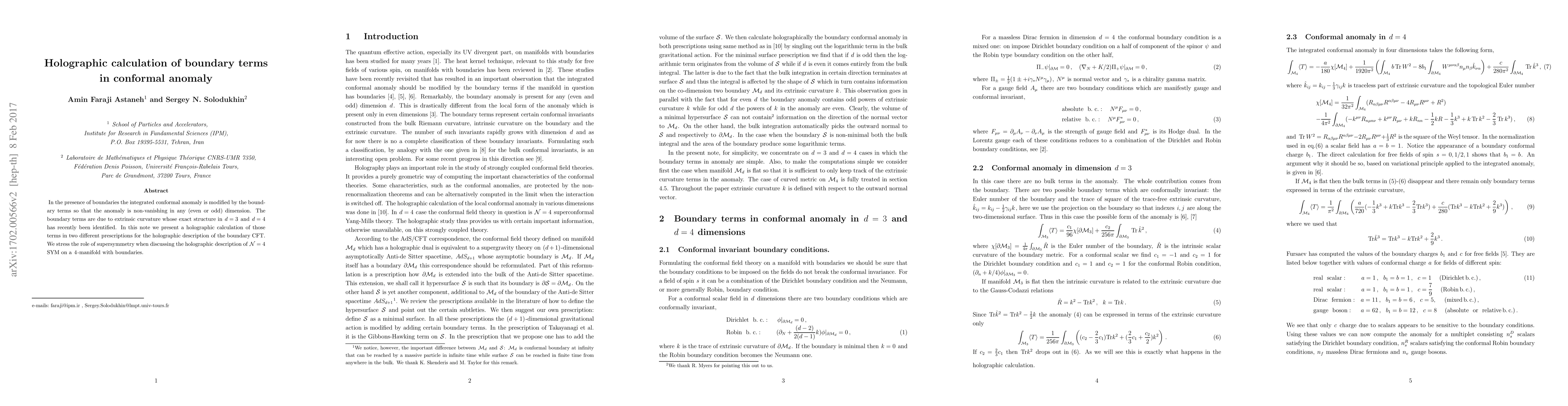 In the presence of boundaries the integrated conformal anomaly is modified by the boundary terms so that the anomaly is non-vanishing in any (even or odd) dimension. The boundary terms are due to extrinsic curvature whose exact structure in $d=3$ and $d=4$ has recently been identified. In this note we present a holographic calculation of those terms in two different prescriptions for the holographic description of the boundary CFT. We stress the role of supersymmetry when discussing the holographic description of ${\cal N}=4$ SYM on a $4$-manifold with boundaries.