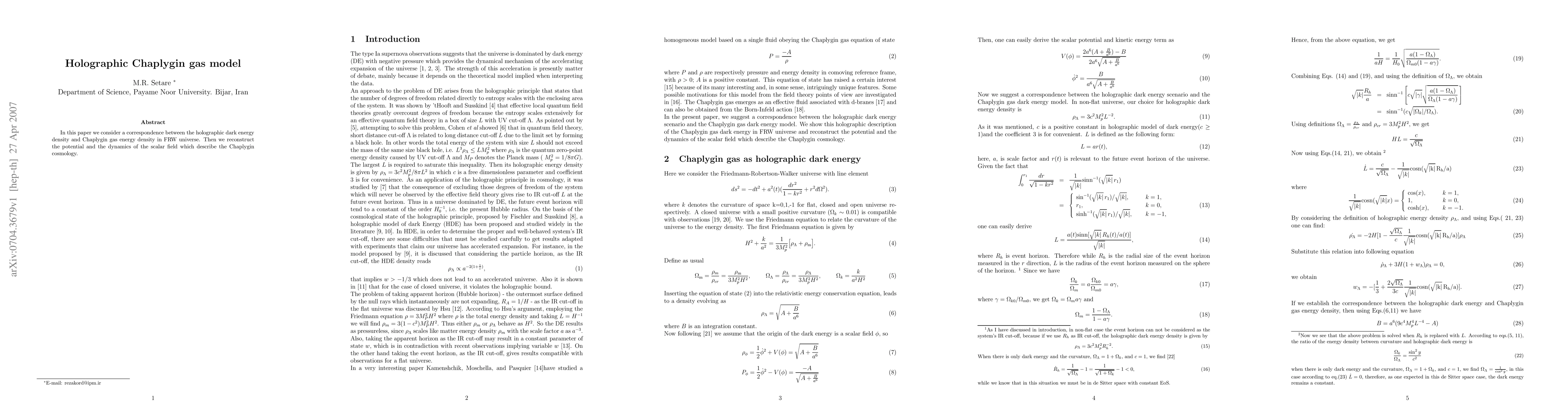 This paper explores the connection between holographic dark energy density and Chaplygin gas in a Friedmann-Robertson-Walker universe, reconstructing the scalar field potential and dynamics to describe Chaplygin cosmology.