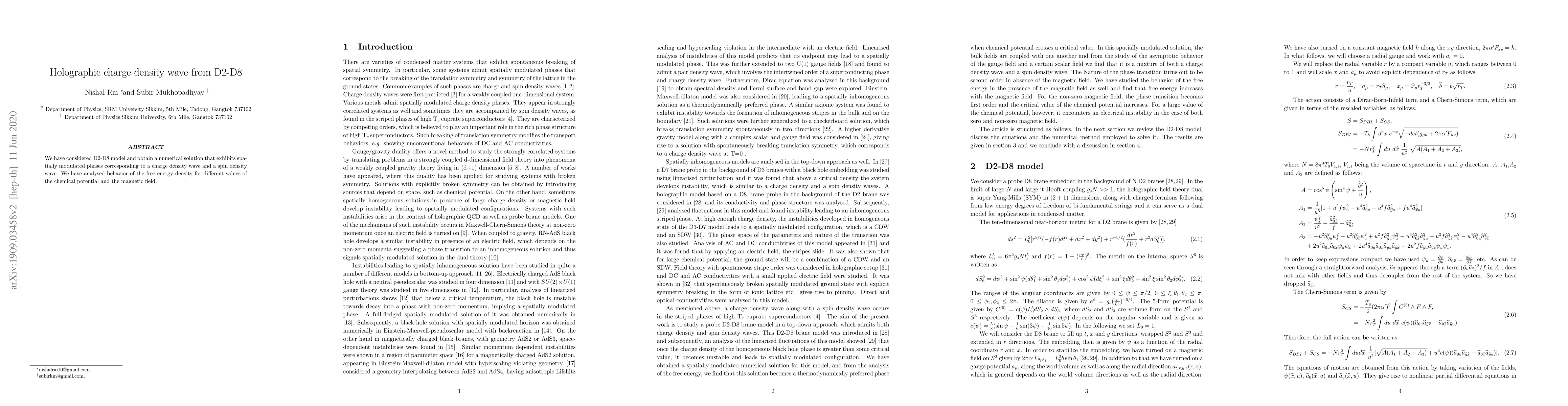 This paper investigates a D2-D8 model to find a numerical solution displaying spatially modulated phases indicative of a charge density wave and a spin density wave. The study analyzes the free energy density's behavior under varying chemical potential and magnetic field conditions.