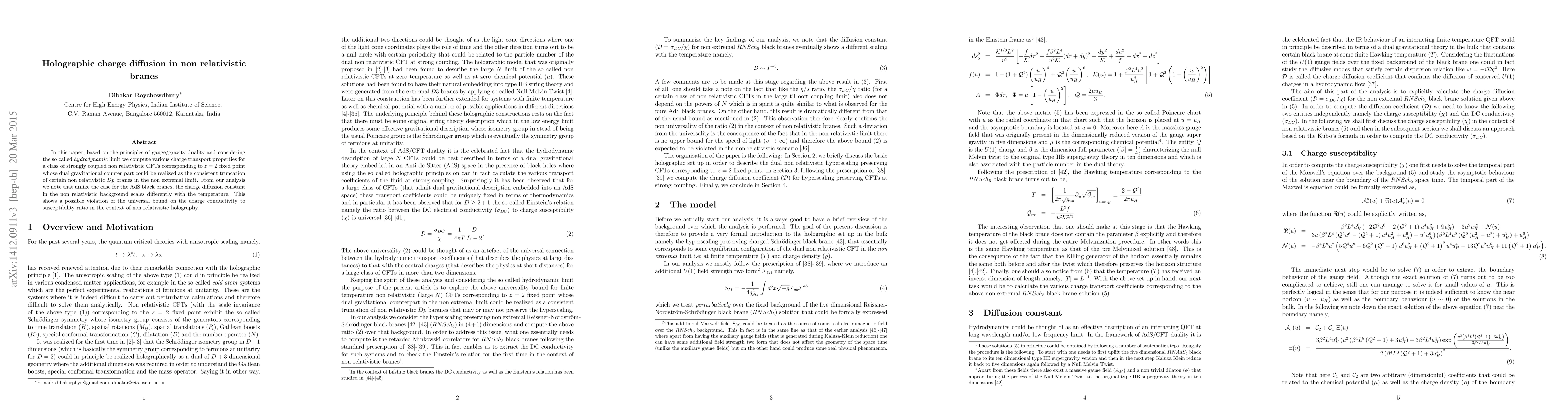 This paper investigates charge diffusion in strongly coupled non-relativistic conformal field theories using gauge/gravity duality, finding that charge diffusion constants scale differently with temperature compared to relativistic systems, potentially violating universal bounds on charge conductivity in non-relativistic holography.