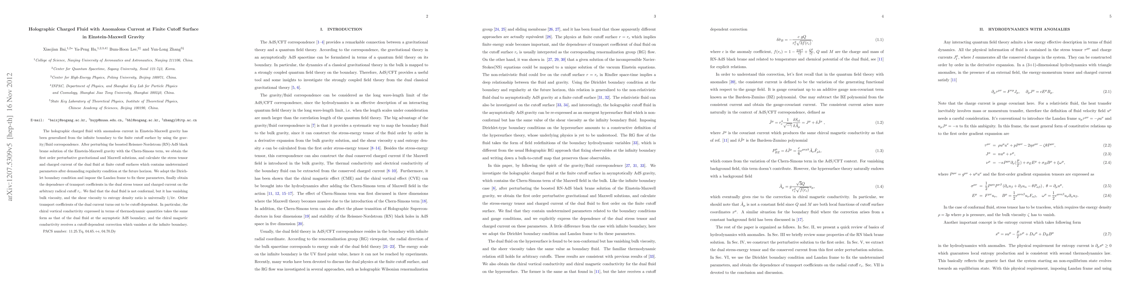 This paper generalizes the holographic fluid with anomalous current from infinite to finite cutoff surfaces in Einstein-Maxwell gravity, finding that the dual fluid is non-conformal but has a universal shear viscosity to entropy density ratio of $1/4\pi$. The study reveals cutoff-dependent corrections in transport coefficients, particularly in chiral vortical and magnetic conductivities.