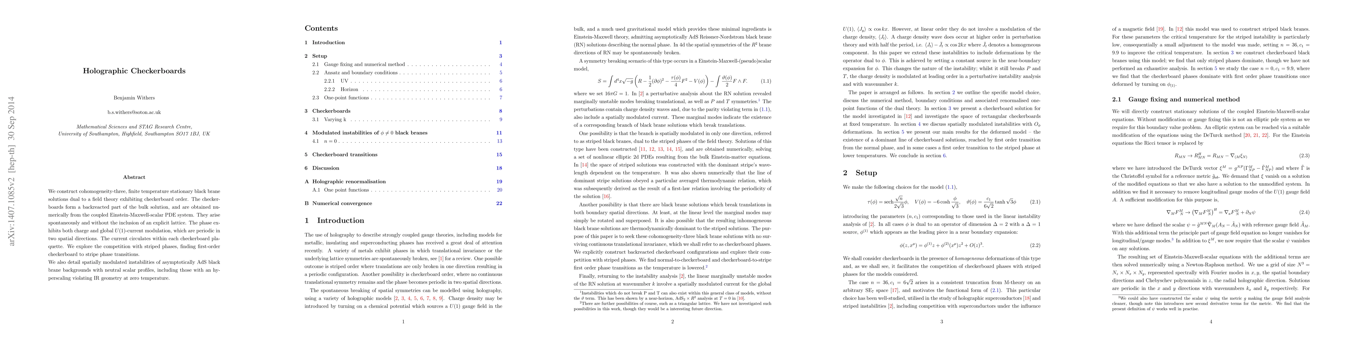 We construct cohomogeneity-three, finite temperature stationary black brane solutions dual to a field theory exhibiting checkerboard order. The checkerboards form a backreacted part of the bulk solution, and are obtained numerically from the coupled Einstein-Maxwell-scalar PDE system. They arise spontaneously and without the inclusion of an explicit lattice. The phase exhibits both charge and global U(1)-current modulation, which are periodic in two spatial directions. The current circulates within each checkerboard plaquette. We explore the competition with striped phases, finding first-order checkerboard to stripe phase transitions. We also detail spatially modulated instabilities of asymptotically AdS black brane backgrounds with neutral scalar profiles, including those with an hyperscaling violating IR geometry at zero temperature.