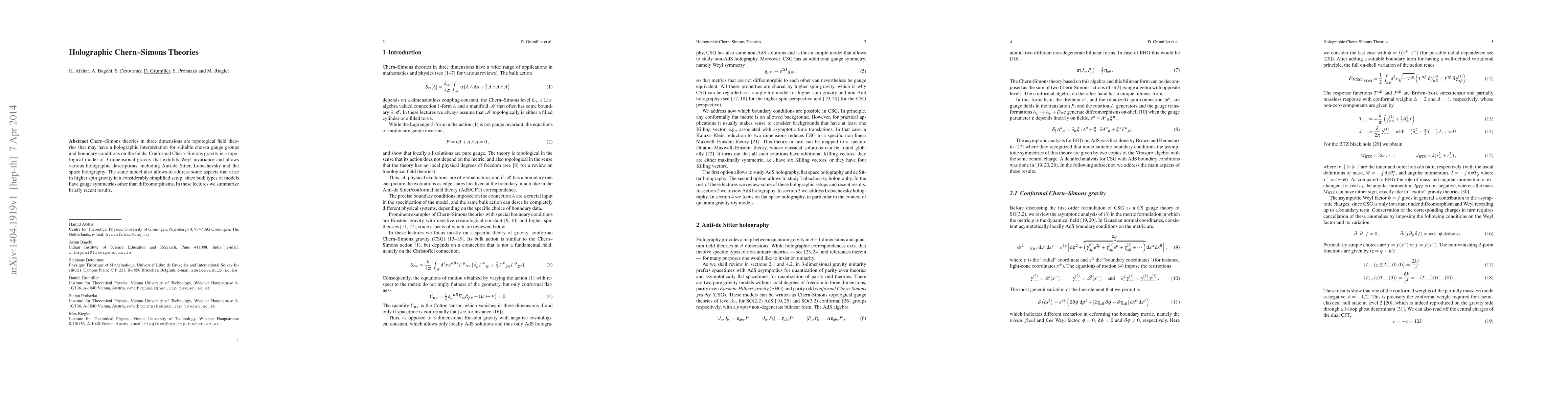 This paper summarizes recent findings on holographic Chern-Simons theories, particularly focusing on conformal Chern-Simons gravity in three dimensions and its interpretations in Anti-de Sitter, Lobachevsky, and flat space holography, alongside simplified higher spin gravity models.