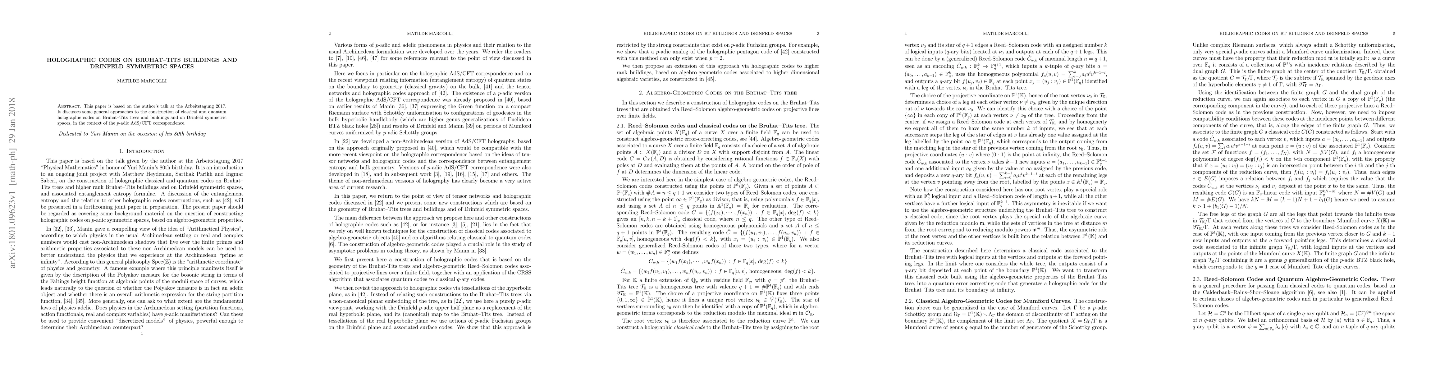 This paper explores methods for constructing classical and quantum holographic codes on Bruhat-Tits buildings and Drinfeld symmetric spaces, relating them to the p-adic AdS/CFT correspondence. The discussion stems from the author's presentation at the Arbeitstagung 2017.
