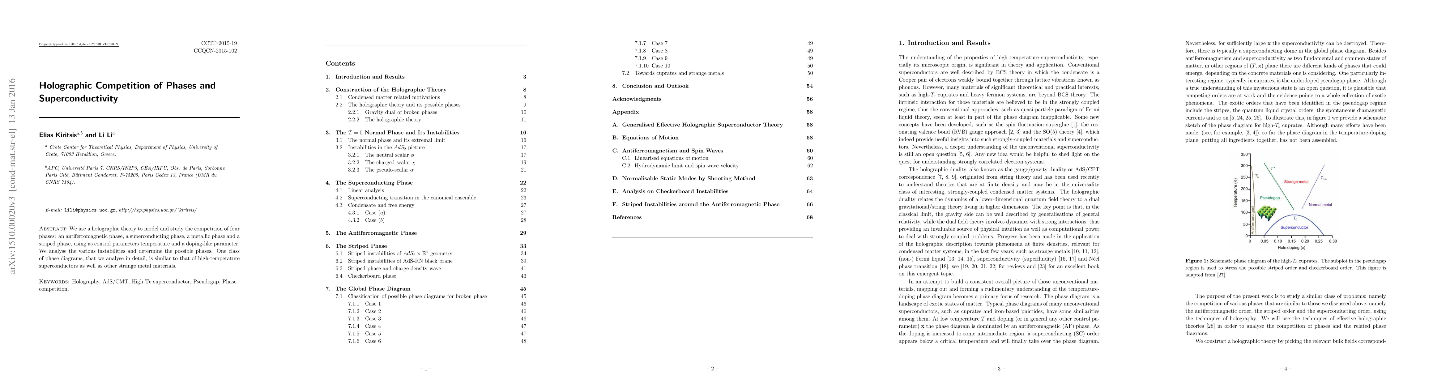 We use a holographic theory to model and study the competition of four phases: an antiferromagnetic phase, a superconducting phase, a metallic phase and a striped phase, using as control parameters temperature and a doping-like parameter. We analyse the various instabilities and determine the possible phases. One class of phase diagrams, that we analyse in detail, is similar to that of high-temperature superconductors as well as other strange metal materials.