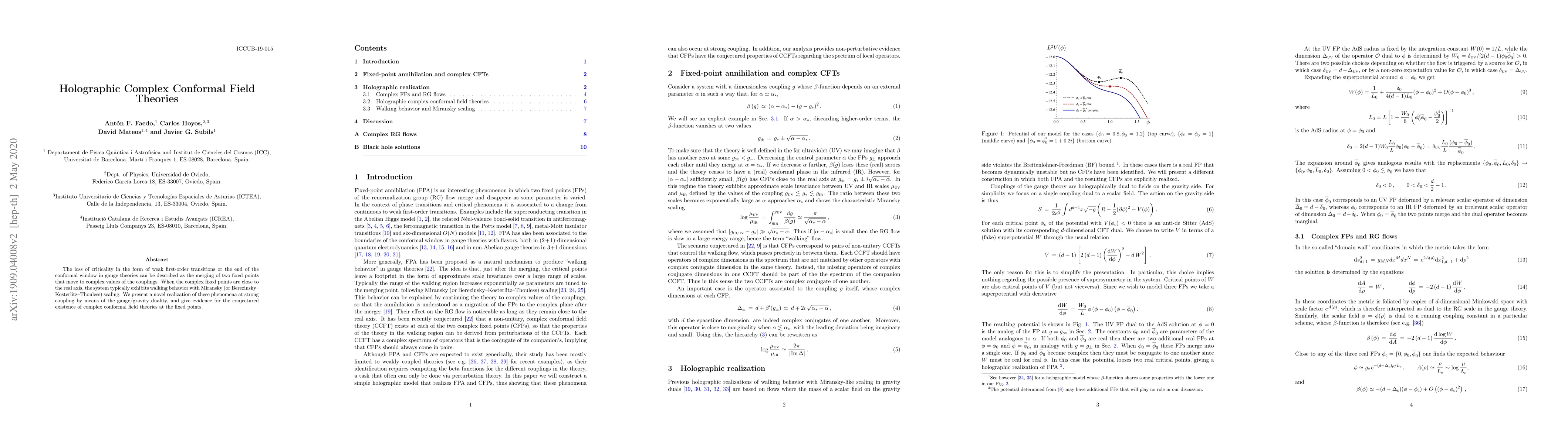 This paper explores the transition from criticality in gauge theories through the merging of complex fixed points, revealing walking behavior and presenting a novel gauge/gravity duality realization that supports the existence of complex conformal field theories at these points.