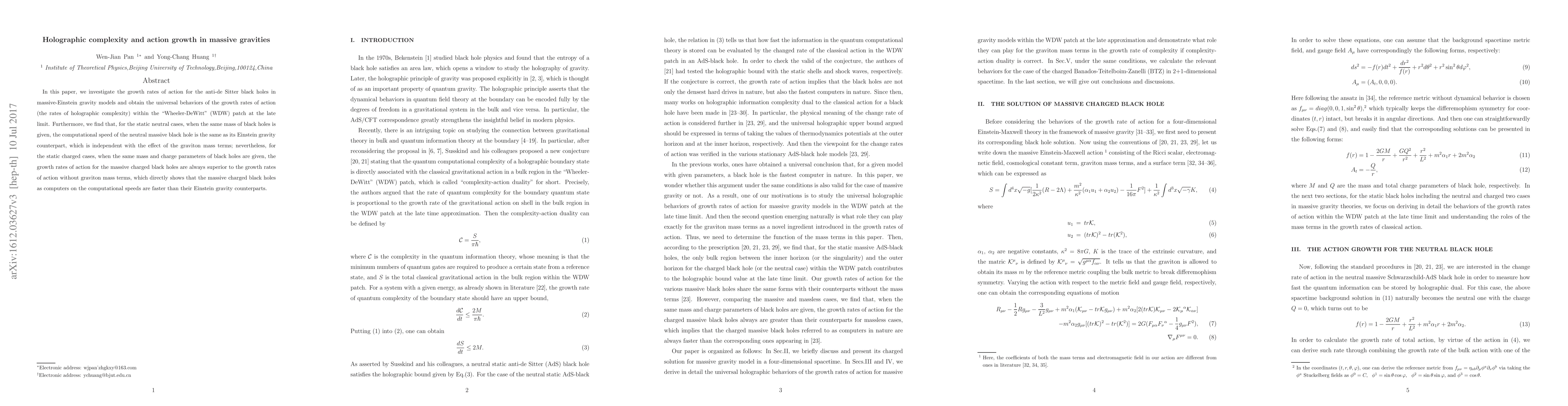 In this paper, we investigate the growth rates of action for the anti-de Sitter black holes in massive-Einstein gravity models and obtain the universal behaviors of the growth rates of action (the rates of holographic complexity) within the "Wheeler-DeWitt"(WDW) patch at the late limit. Furthermore, we find that, for the static neutral cases, when the same mass of black holes is given, the computational speed of the neutral massive black hole is the same as its Einstein gravity counterpart, which is independent with the effect of the graviton mass terms, nevertheless, for the static charged cases, when the same mass and charge parameters of black holes are given, the growth rates of action for the massive charged black holes are always superior to the growth rates of action without graviton mass terms, which directly shows that the massive charged black holes as computers on the computational speeds are faster than their Einstein gravity counterparts.