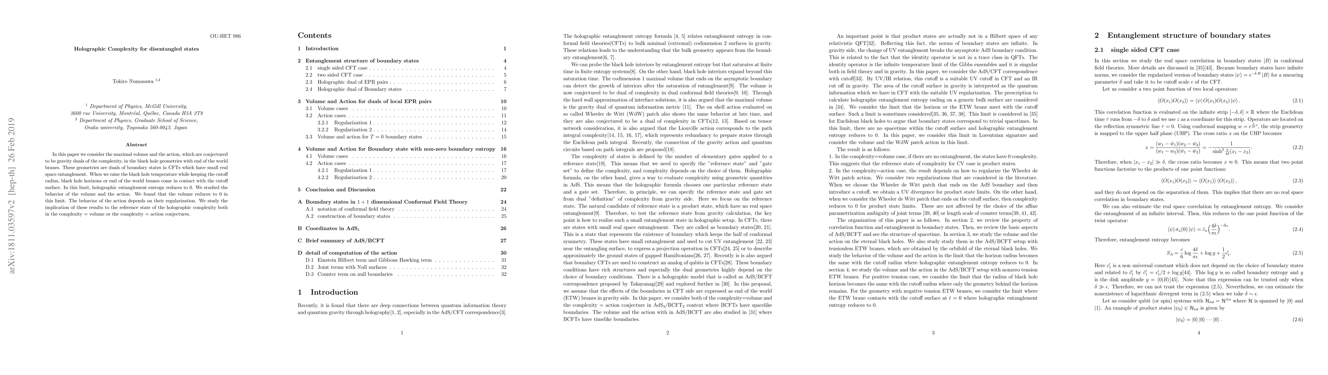In this paper we consider the maximal volume and the action, which are conjectured to be gravity duals of the complexity, in the black hole geometries with end of the world branes. These geometries are duals of boundary states in CFTs which have small real space entanglement. When we raise the black hole temperature while keeping the cutoff radius, black hole horizons or end of the world branes come in contact with the cutoff surface. In this limit, holographic entanglement entropy reduces to 0. We studied the behavior of the volume and the action. We found that the volume reduces to 0 in this limit. The behavior of the action depends on their regularization. We study the implication of these results to the reference state of the holographic complexity both in the complexity = volume or the complexity = action conjectures.